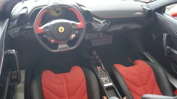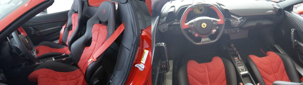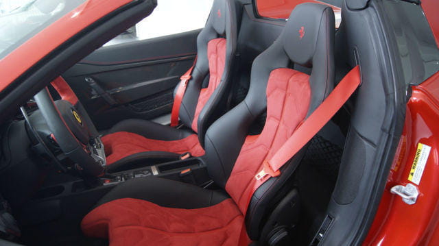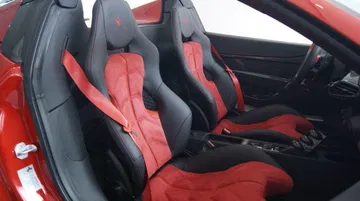 - Interior en piel y fibra de carbono, volante en dos tonos, cuentarrevoluciones de color amarillo y cinturones de seguridad en rojo