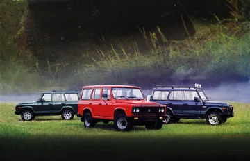 Usa una transmisión manual de 4 velocidades con una caja de trasferencia de doble rango que lleva la potencia hasta las 4 ruedas (aunque también existieron versiones 4×2). Para detenerse, equipa frenos de tambor a las 4 esquinas, Estos quedan ocultos por llantas de 16″ enfundadas en neumáticos todoterreno.