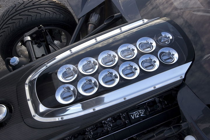 Su carrocería cupé de imponente morro alargado está hecha de fibra de carbono. Destaca la cubierta transparente que hay sobre el capó y que deja ver las trompetas de admisión hasta fusionarse con la consola central del interior.