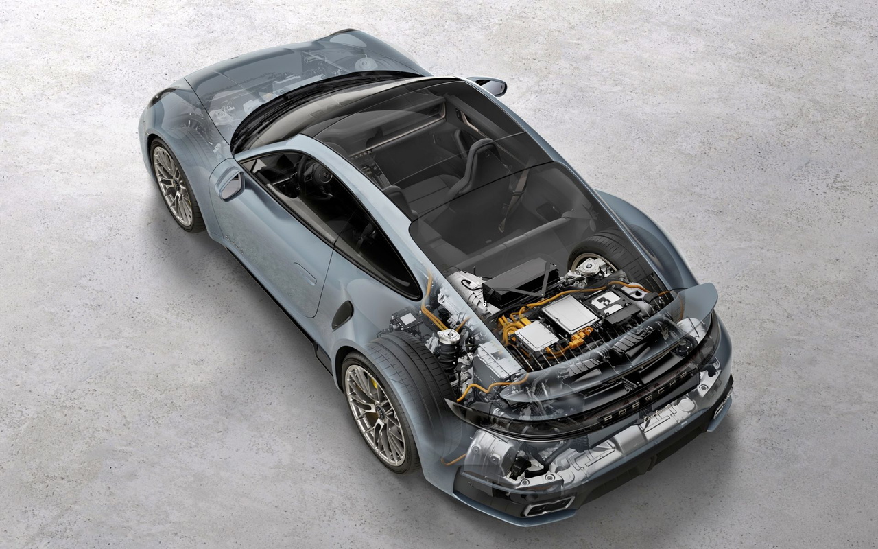 El sistema T-Hybrid del actual Porsche 911 (992.2), utilizado en los últimos GTS y Turbo S, funciona más parecido a un coche híbrido suave que a un híbrido completo, ya que el coche no puede funcionar solo en modo eléctrico, pero ofrece 54 CV adicionales (40 kW). No es un sistema pensado para reducir consumos sino para ofrecer un plus de potencia.
