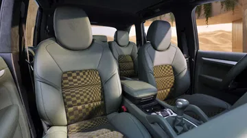 El interior es un espectáculo. La tapicería es de cuero en color verde inglés, una tapicería especial de la gama Leather to Sample, y se combina con el mítico patrón Pasha en negro y verde oliva. La parte central de los asientos y el interior de la guantera también están cubiertos con este acabado tan característico de Porsche. Y las molduras de las puertas y del salpicadero, así como los abridores de las puertas, están acabadas en aluminio cepillado.