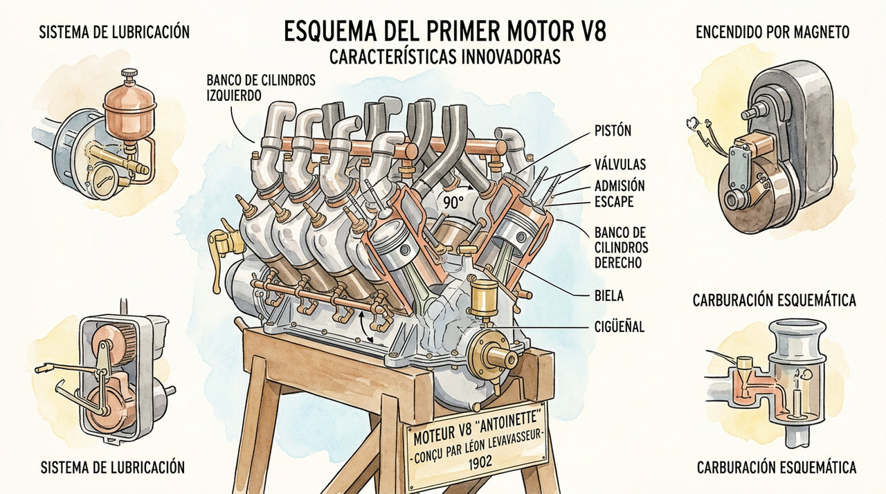 La clave está en la arquitectura en V: permitía reducir el peso y el tamaño respecto a los motores en línea, algo esencial para aviones y lanchas rápidas. Levavasseur no solo buscaba potencia, sino también eficiencia estructural. Este enfoque ingenieril define al V8 original, mucho antes de que se convirtiera en un símbolo de exceso.