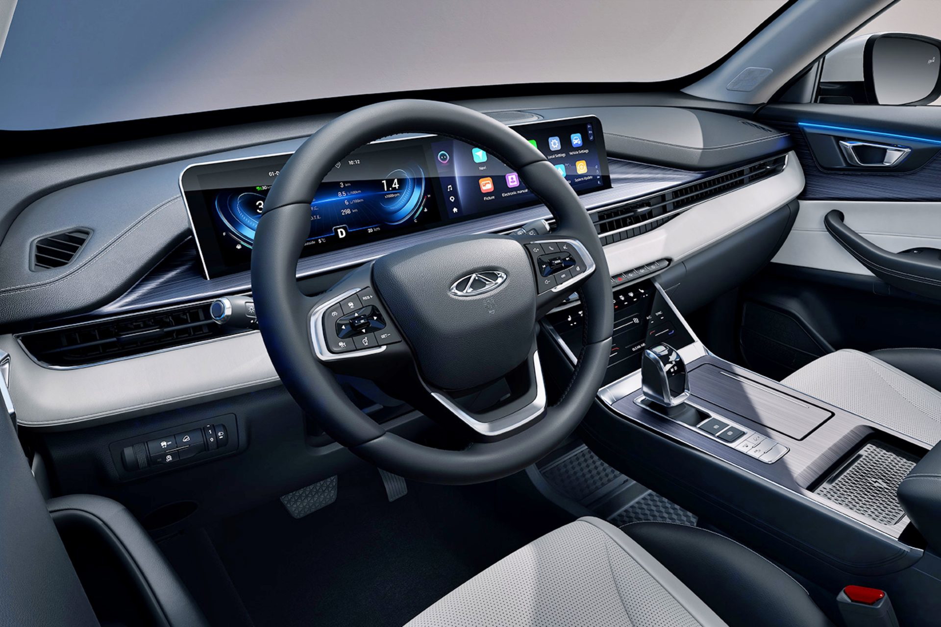 En lo que respecta al interior, el Tiggo 4 Pro también sigue una línea similar a la vista en los dos modelos que EBRO produce en Barcelona, pero de nuevo especialmente con respecto al S700, con una única superficie en la que acoge dos pantallas, la del cuadro de mandos y la central, y una consola que divida la zona del conductor y el pasajero delantero de proporciones y estética muy cercana a la del S700.