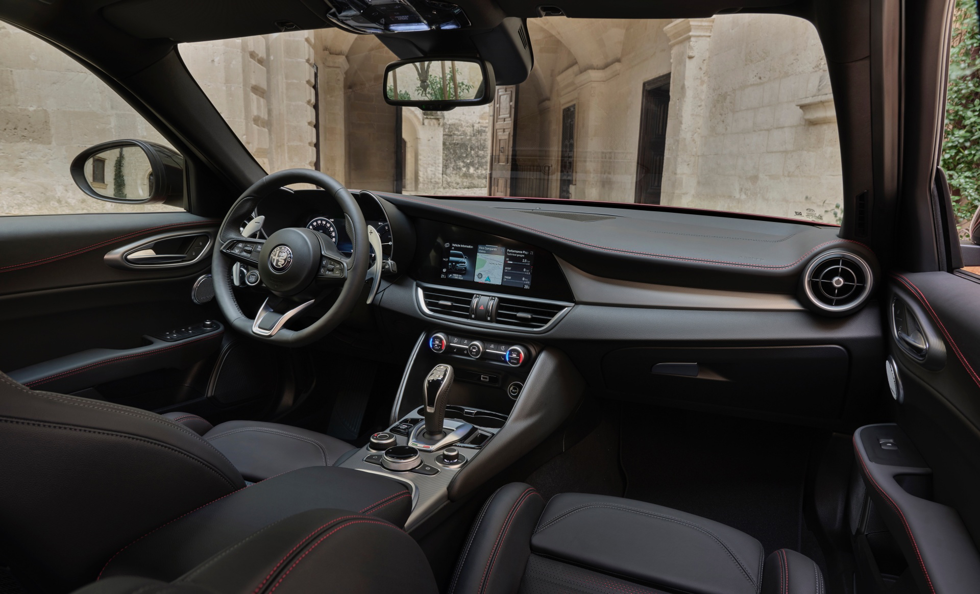 En el habitáculo también hay distintos elementos que varían respecto a un Alfa Romeo convencional. El más importante es un conjunto de asientos con cuero negro perforado y costuras en color rojo que, adicionalmente, llevan bordado el logotipo de la firma y el nombre de su serie limitada en el reposacabezas. Los pespuntes carmesí también son visibles sobre los revestimientos interiores.