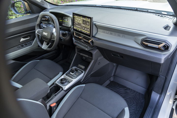 Esta versión del Duster es idéntica al resto en cuanto al habitáculo y espacio de carga, así que apenas me detendré aquí. Solo quiero recordaros que tiene un interior construido con materiales duros y sólidos, que no presentaba crujidos tras el considerable maltrato al que lo sometimos. Lo que sí es una novedad es una pantalla con información todoterreno en el sistema de infotainment. Nos muestra el reparto de potencia y un cómodo inclinómetro. Por cierto, al ser un vehículo de GLP, como ocurre en otros Duster, el espacio reservado a la rueda de repuesto está ocupado por su depósito.