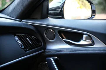 El techo y los pilares están forrados en Alcantara de color negro, contribuyendo a una atmosféra elegante y refinada.