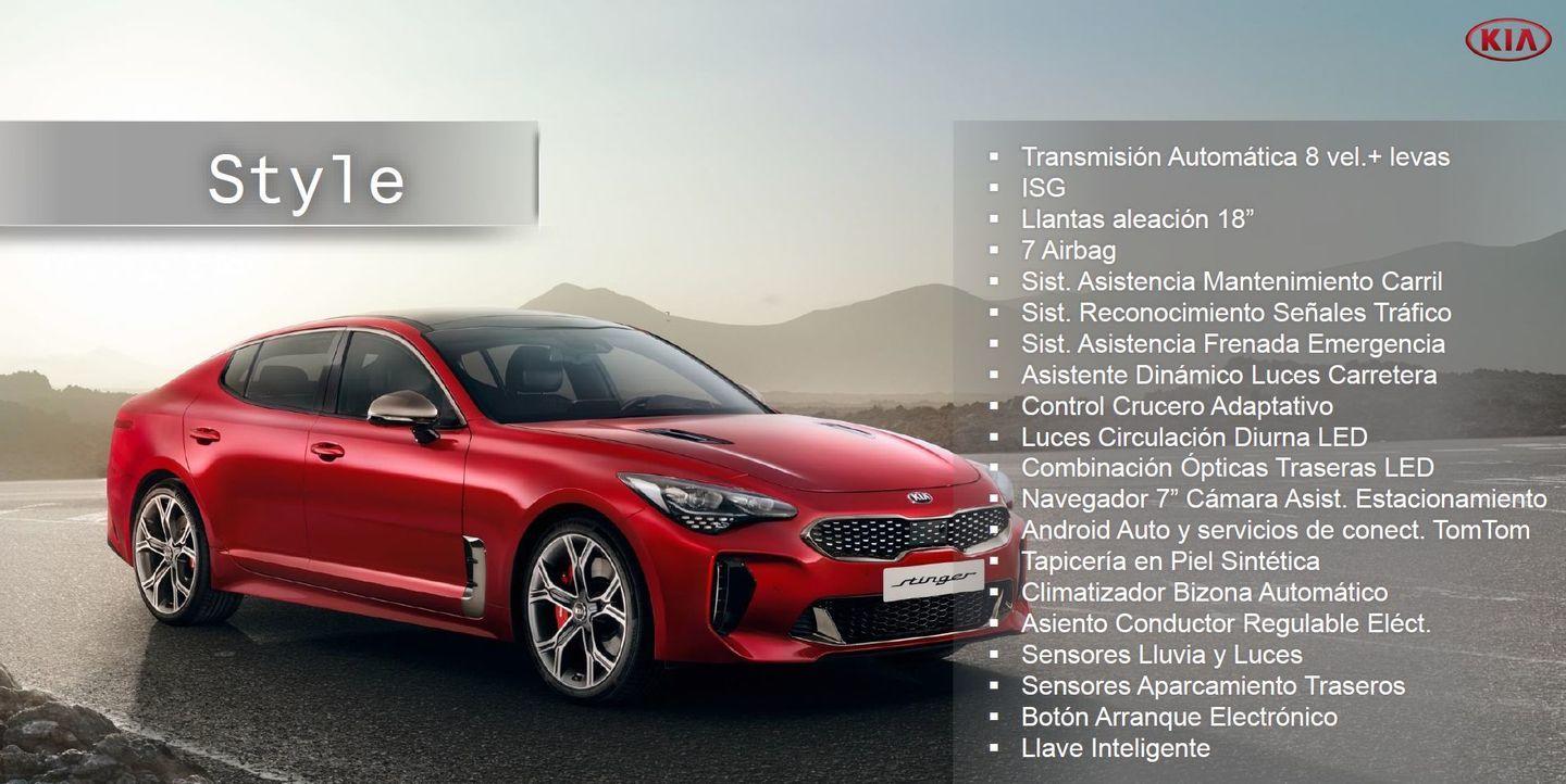 Las versiones Style de acceso se diferencian de los Stinger GT por sus llantas de 17 pulgadas, dos colas de escape y un kit de carrocería menos agresivo.