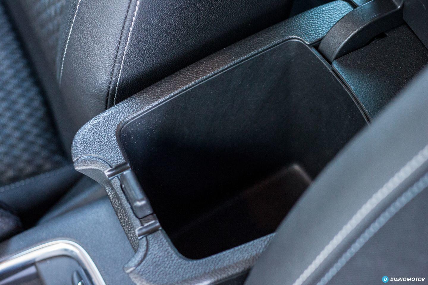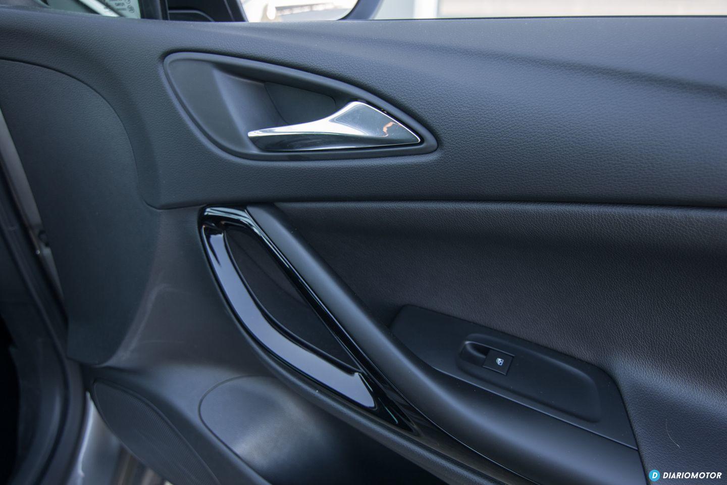 La consola central del Opel Astra carece de huecos portaobjetos. Nos tenemos que conformar con los huecos portabebidas – con tapa corredera – y el espacio disponible bajo el reposabrazos, dicho sea de paso, sin posibilidad de regulación. Si a esto le unimos una guantera pequeña y sin iluminación, así como unos huecos no especialmente grandes en sus puertas – aunque admiten botellas de agua de hasta 1,5 litros – lo cierto es que el Opel Astra no pasa del suficiente en cuanto a almacenamiento interior. Sin embargo, es un interior agradable, en el que se pueden pasar cómodamente horas y miles y miles de kilómetros. Para empezar, está muy correctamente acabado.