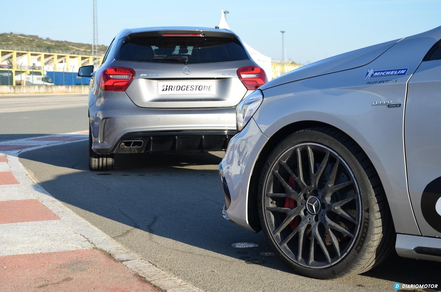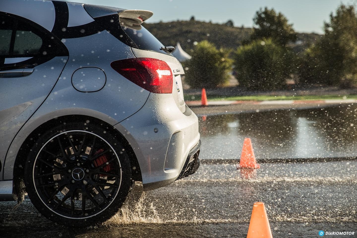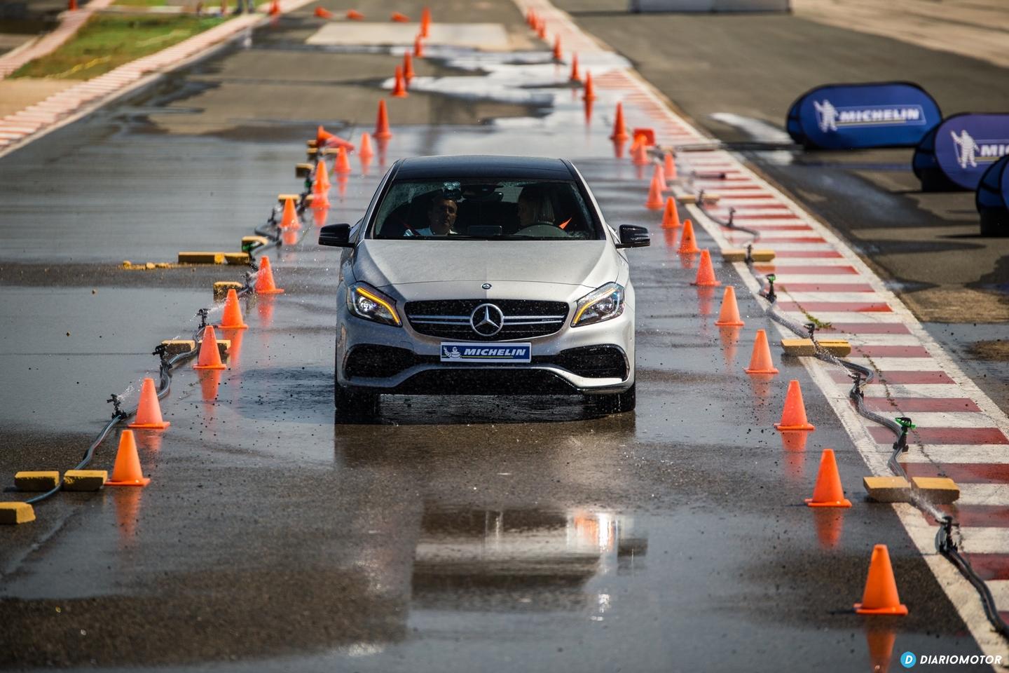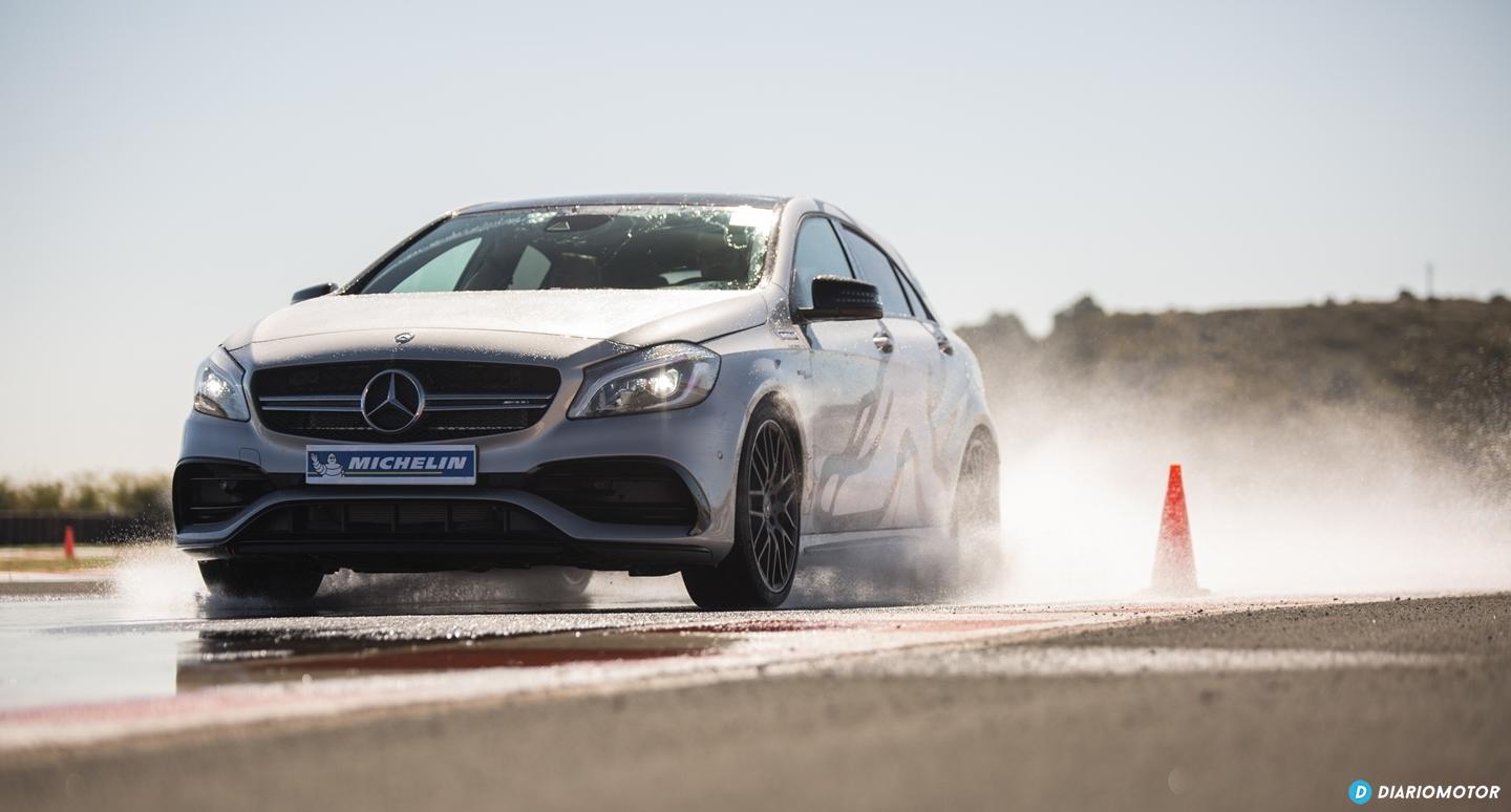 La segunda prueba la realizamos a los mandos del Mercedes-AMG A45 simulando una frenada de emergencia en suelo mojado con gran presencia de agua desde 80 Km/h. La comparativa de producto es la misma, Michelin Sport 4 S frente al Bridgestone Potenza S001. Tras las 6 pasadas obligadas, de nuevo el compuesto de Michelin consigue unos mejores resultados con un recorte en la distancia de frenado de entre 1 y 1,5 metros. La elección del mismo modelo de neumático rival en ambas pruebas respondió, según los responsables durante el evento, a que ese modelo de Bridgestone representaba los valores medios de la competencia.
