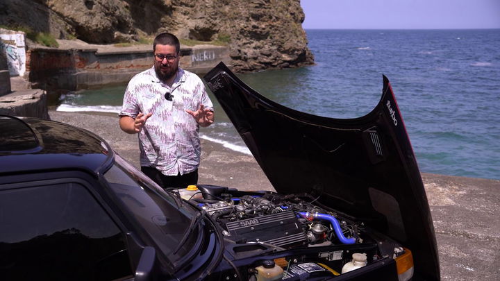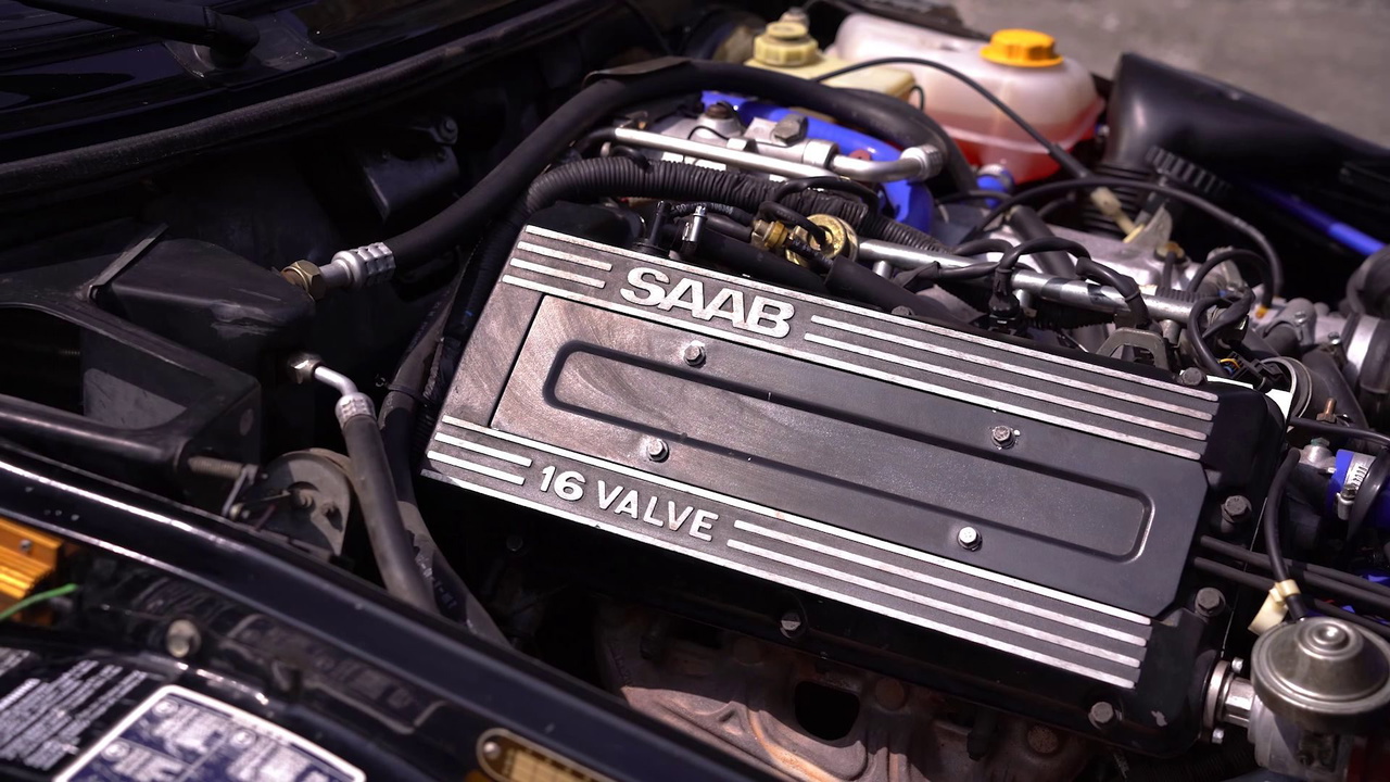 Lo primero que siempre me ha llamado la atención de este coche, es cómo se abre su capó. Bascula hacia arriba y hacia delante, de forma muy efectista. Casi parece Darth Vader abriendo su casco. Este Saab 900 lleva un motor 2.0 turbo de cuatro cilindros, 16 válvulas y 175 CV de potencia. Este motor fue el primer motor turbo de producción con culata de 16 válvulas, dicho sea de paso. El bloque está inclinado en 45 grados, y la peculiaridad es que la distribución está junto al habitáculo, mientras que la «salida» del cigüeñal es hacia delante.