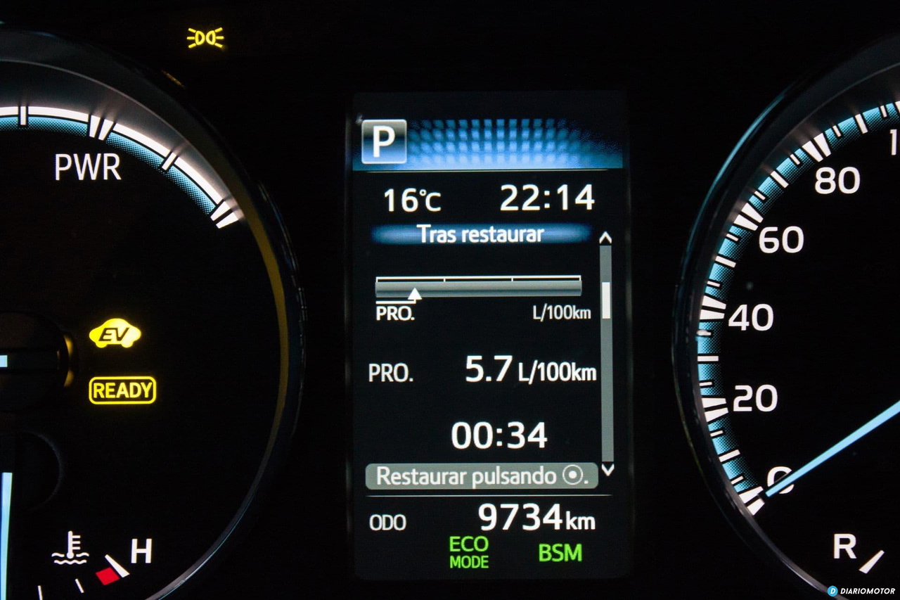 Explotar al máximo el sistema híbrido de este SUV es necesario para obtener consumos aquilatados: hay que aprovechar la frenada regenerativa – el cambio de tacto entre la frenada convencional y regenerativa se sigue notando – y tratar de explotar al máximo el tiempo que estamos conduciendo en modo eléctrico. Conducir de forma eficiente tiene grandes recompensas en este coche. Como apunte curioso, con la batería muy cargada, en terreno llano y a unos 40 km/h, he conseguido recorrer 2,3 kilómetros en modo EV. Si superamos los 60 km/h o necesitamos más aceleración puntual, el modo 100% eléctrico del todocamino se desactivará, pasando al modo Eco o al modo Normal.