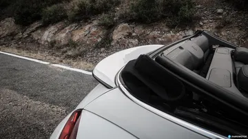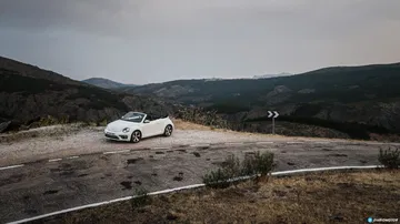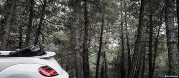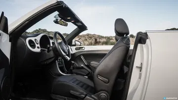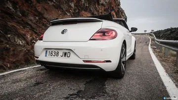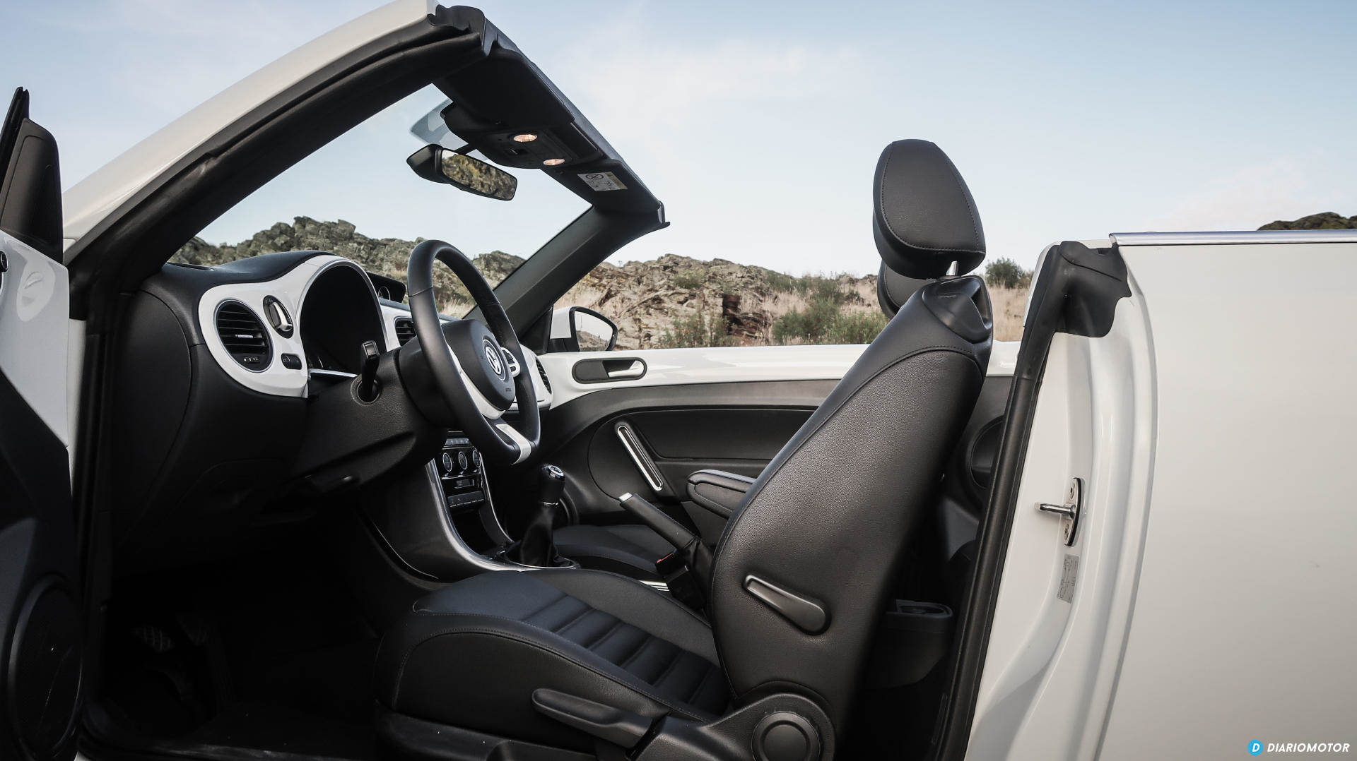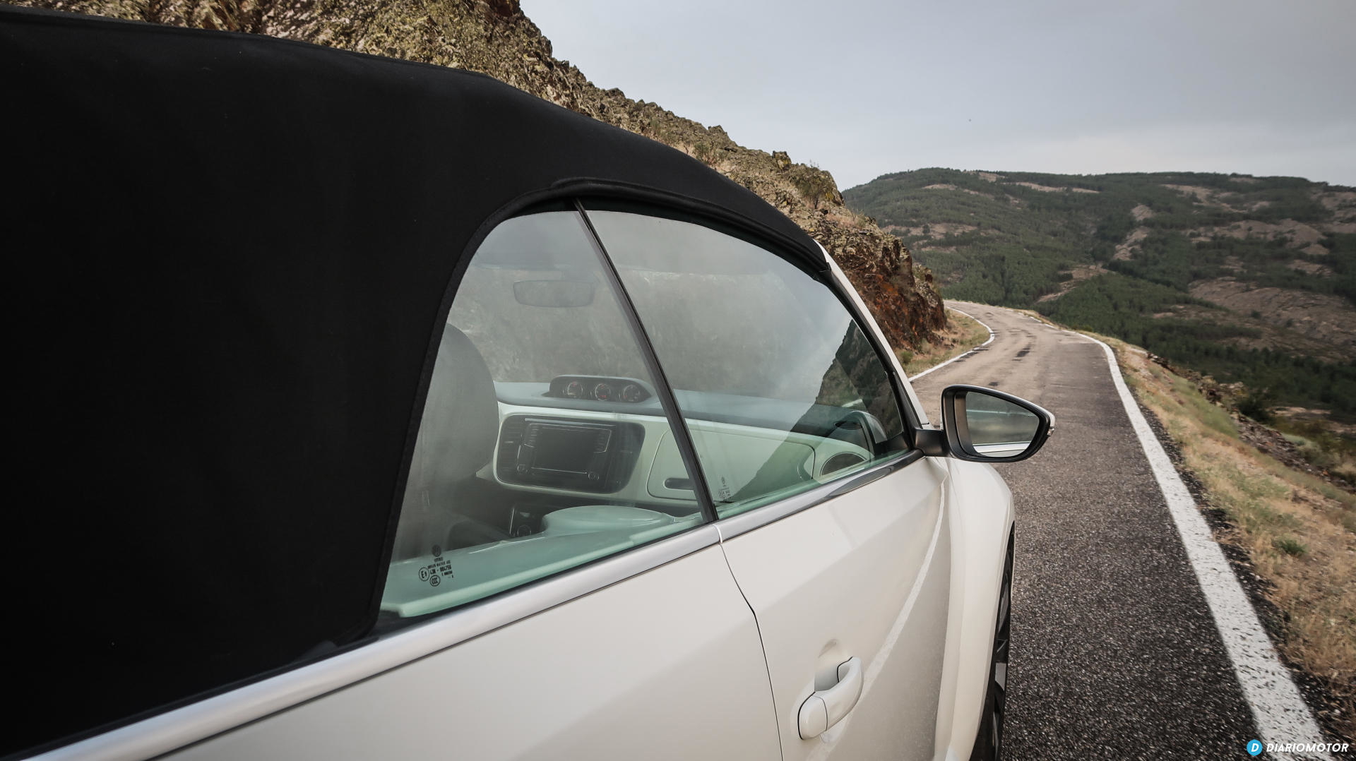 Un alerón se encarga de reclamar el protagonismo de la zaga, perfectamente enmarcada, como el frontal, por el conjunto de ópticas y la capota de lona, de accionamiento automático, plegada sobre el portón del maletero, nos invita a zambullirnos en su habitáculo y disfrutar de la brisa de las interminables noches de verano, con el no tan grato sonido de una mecánica diésel sí, pero con consumos más comedidos a cambio, que nos invitan a realizar también largos viajes con este blanco escarabajo.