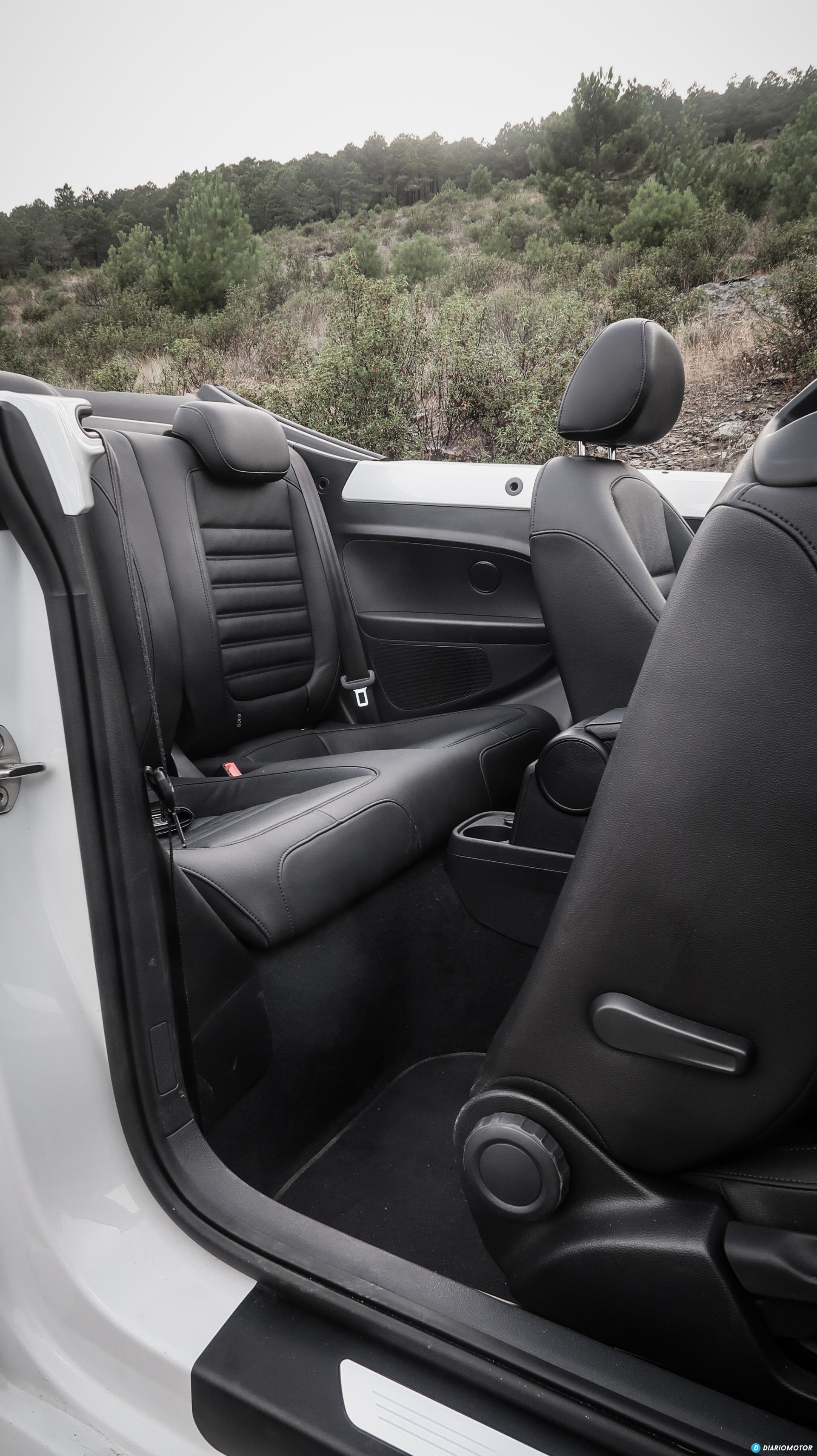Acceder a las plazas traseras del Volkswagen Beetle descapotado es una gozada, puedes entrar sin agacharte, el acceso no es del todo incómodo y en las dos asientos posteriores disponibles hay espacio suficiente para que un adulto haga un viaje largo. Obviamente iríamos mejor sentados en los asientos traseros de un Volkswagen Arteon… pero creedme, estos asientos nos invitan a usarlos más allá de cortos recorridos urbanos.