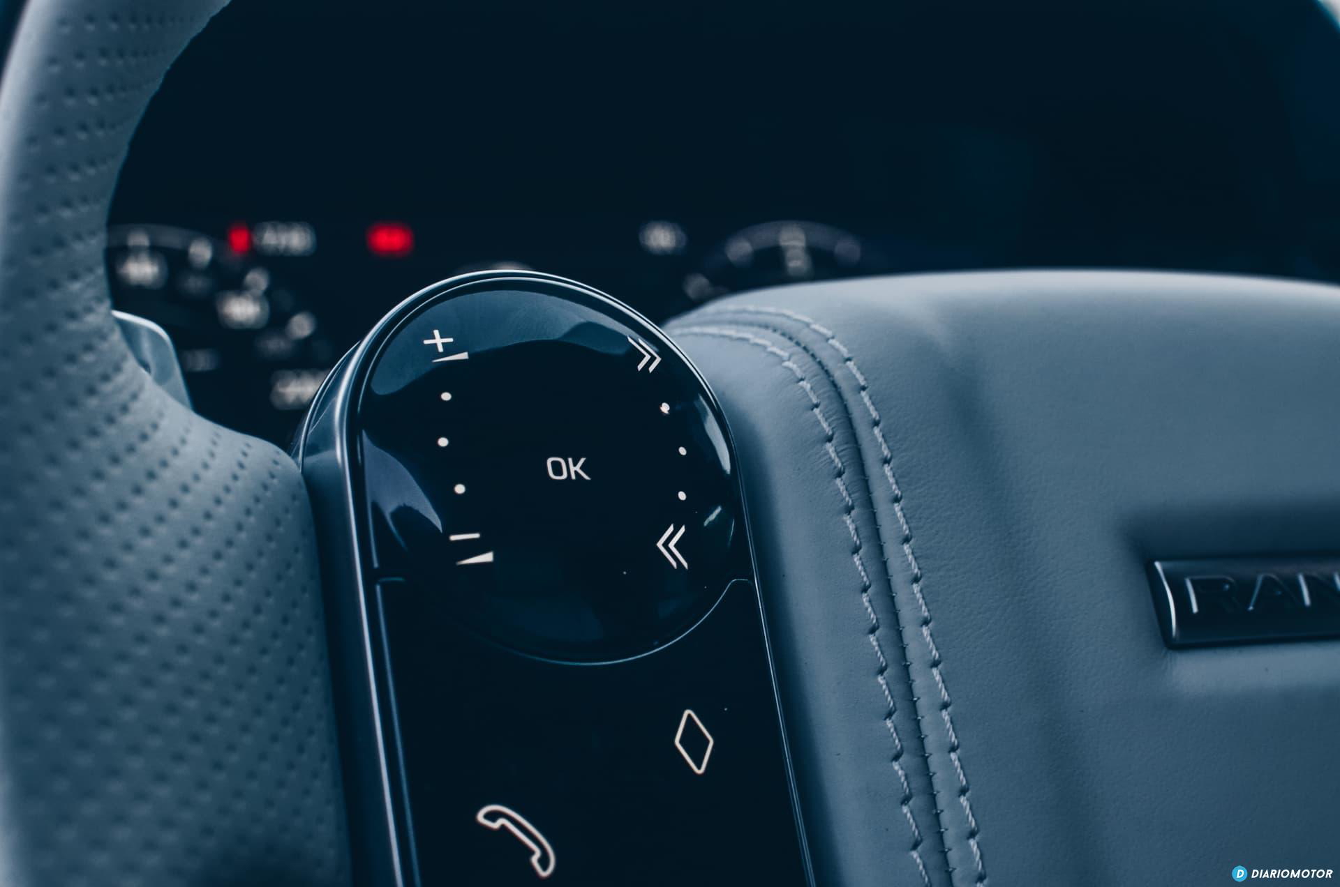 Esta doble pantalla es apoyada, en esa vocación techie del Velar, por una instrumentación totalmente digital, de 12.3 pulgadas y además tenemos un HUD encargado de proyectarnos la información en el parabrisas. Otro de los elementos más llamativos de este interior es su volante, con dos superficies táctiles flanqueando la parte central que hacen que percibamos a este volante multifunción como el volante multifunción que tendrán todas las marcas en dos o tres años. Por ejemplo para subir el volumen del sistema de sonido sólo tenemos que deslizar el dedo, nada de ruletas.