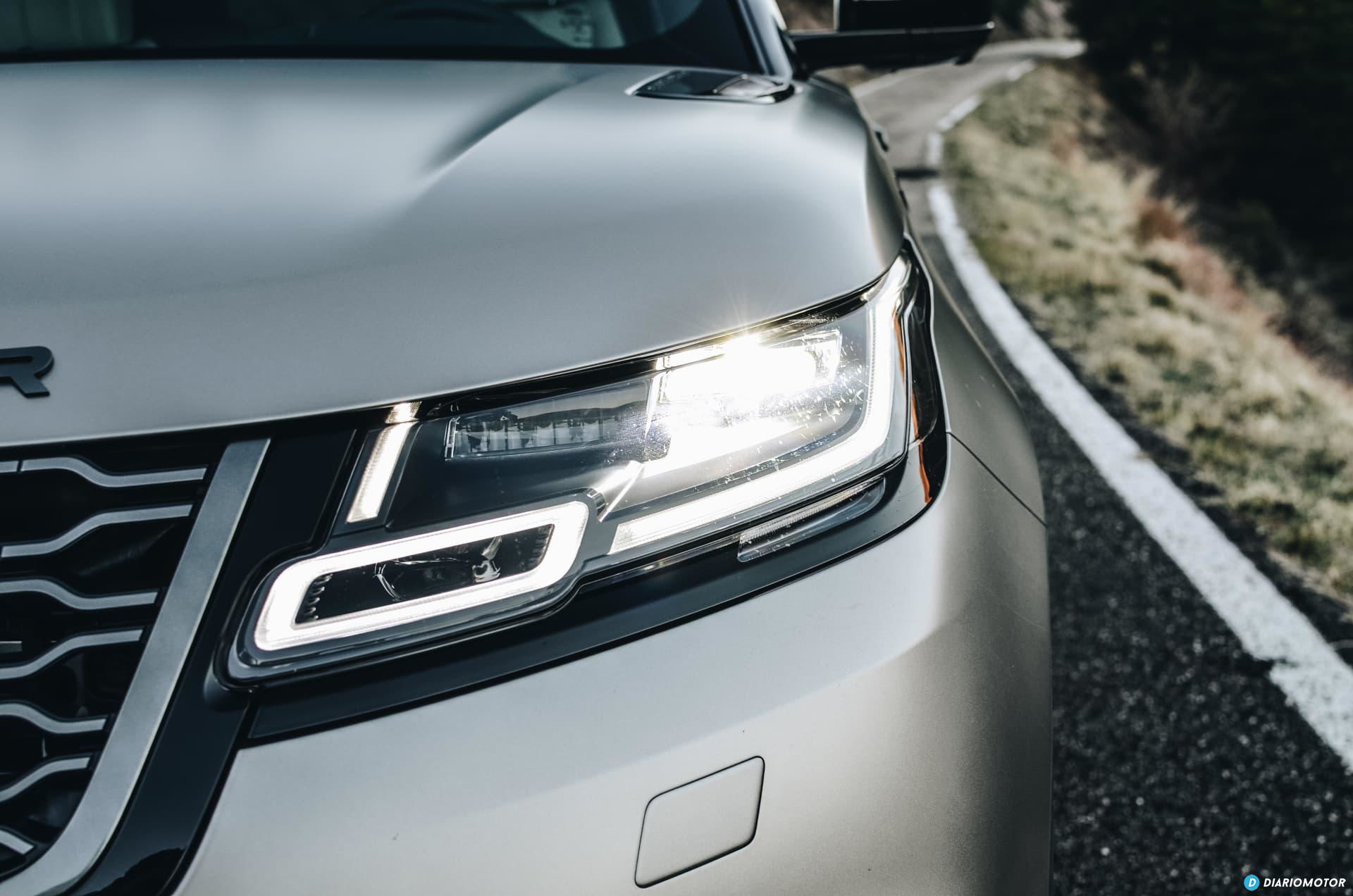 Las estrechas ópticas posteriores buscan nuestra atención en la bella silueta del Velar alargándose por el mencionado lateral, con un bonito diseño a golpe de LED que se ve bien reforzado por las ópticas delanteras, que siguen una estrategia y unas formas semejantes. La parrilla frontal le da un toque clásico al conjunto y al rededor del bonito color grisáceo de nuestra unidad, mate, se agolpan una serie de acentos bronce.