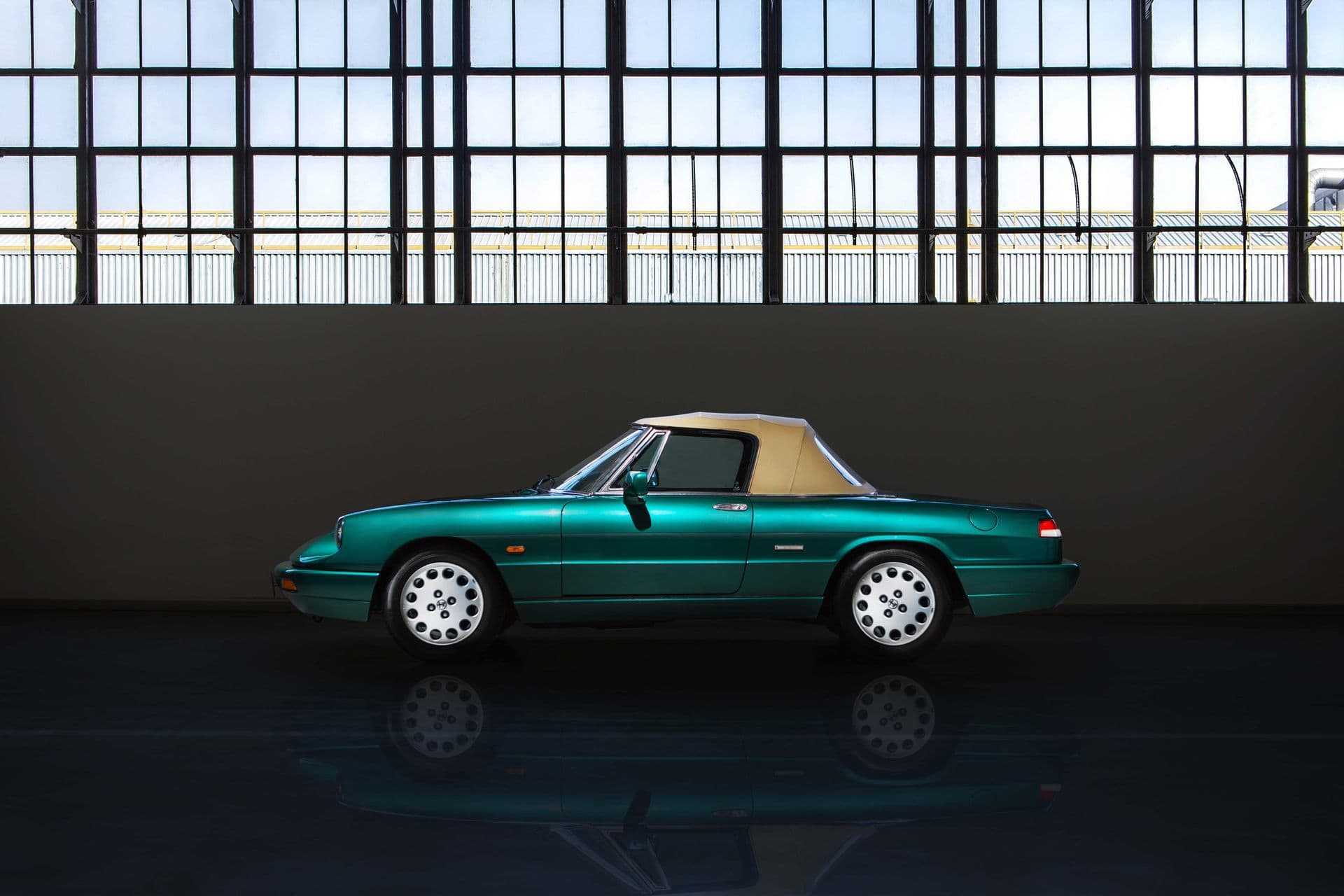 Alfa Romeo Spider (1991): esta unidad pertenece a la última versión de los Alfa Romeo Spider, fabricada hasta entrados los años 90 – y diseñado originalmente por Battista Pininfarina en 196. En concreto esta unidad siempre ha estado en manos de FCA, y fue usada para diversas pruebas técnicas – como por ejemplo, la prueba de colores personalizados. Está actualmente pintado en un precioso color verde con capota de color beige.