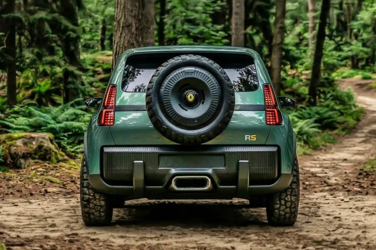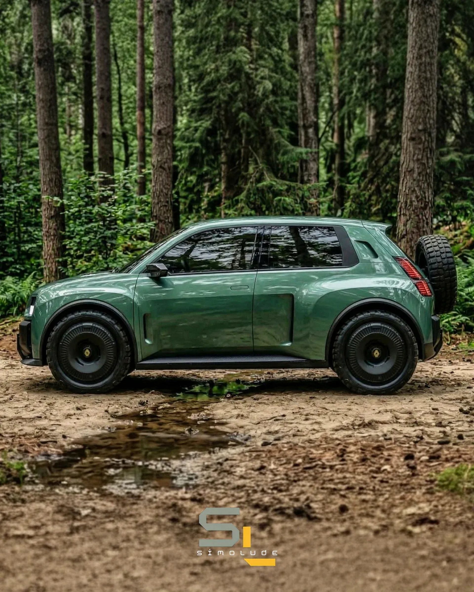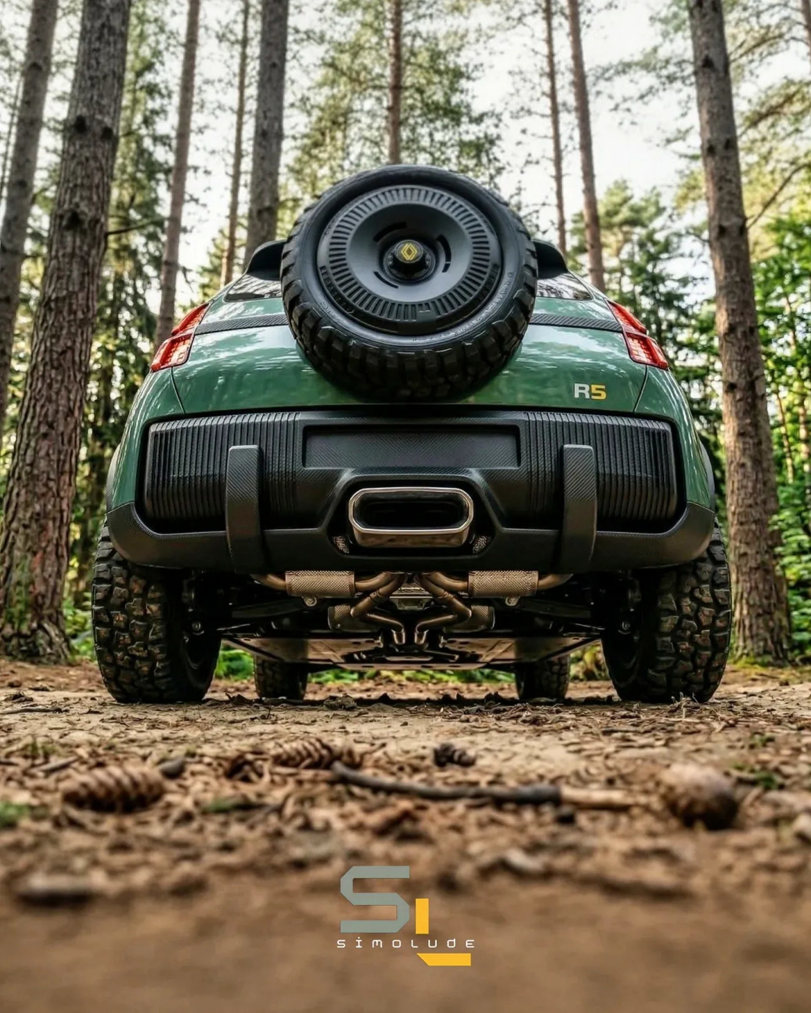 Tomando como punto de partida el modelo original, Simolude ha mantenido las proporciones del mismo tomándose la licencia de modificar todo el frontal, algo que se antoja necesario si bajo el capó se pretende colocar un bloque térmico. Junto con ello, una altura libre al suelo exagerada, protecciones en todos los bajos y ambos paragolpes, así como ruedas de tipo AT con una de repuesto colocada sobre el portón trasero, hacen de este R5 un pequeño bicho que quiere, sin duda, ensuciarse.