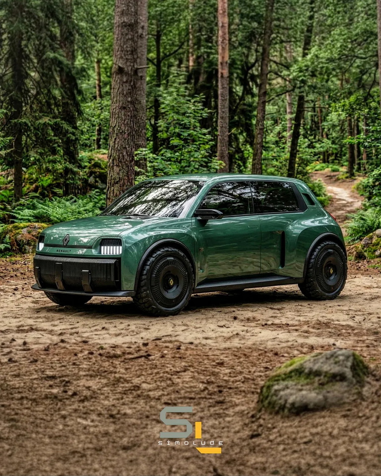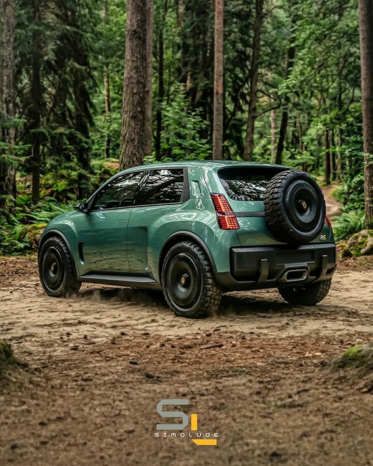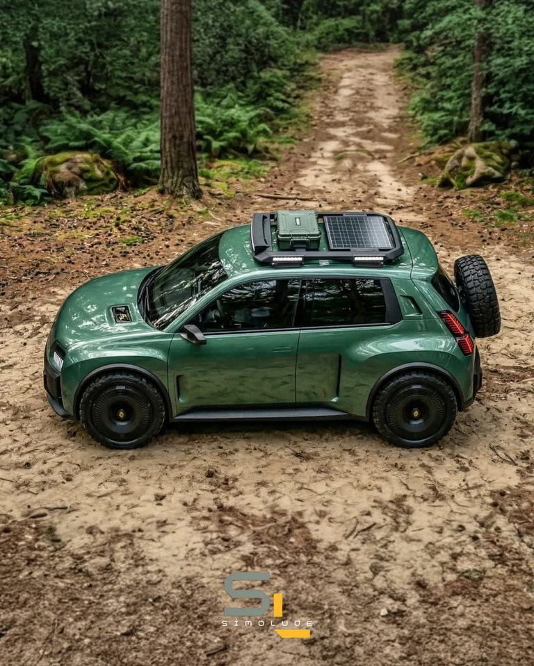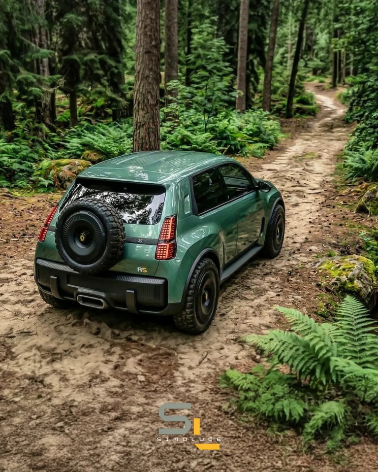 Tomando como punto de partida el modelo original, Simolude ha mantenido las proporciones del mismo tomándose la licencia de modificar todo el frontal, algo que se antoja necesario si bajo el capó se pretende colocar un bloque térmico. Junto con ello, una altura libre al suelo exagerada, protecciones en todos los bajos y ambos paragolpes, así como ruedas de tipo AT con una de repuesto colocada sobre el portón trasero, hacen de este R5 un pequeño bicho que quiere, sin duda, ensuciarse.