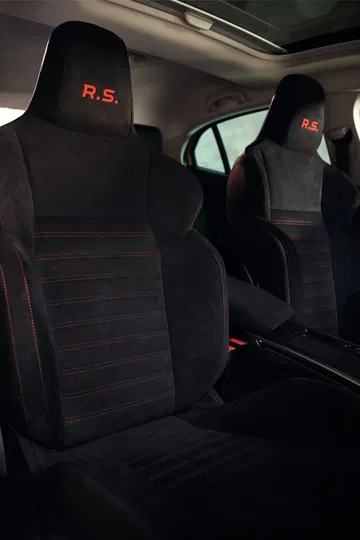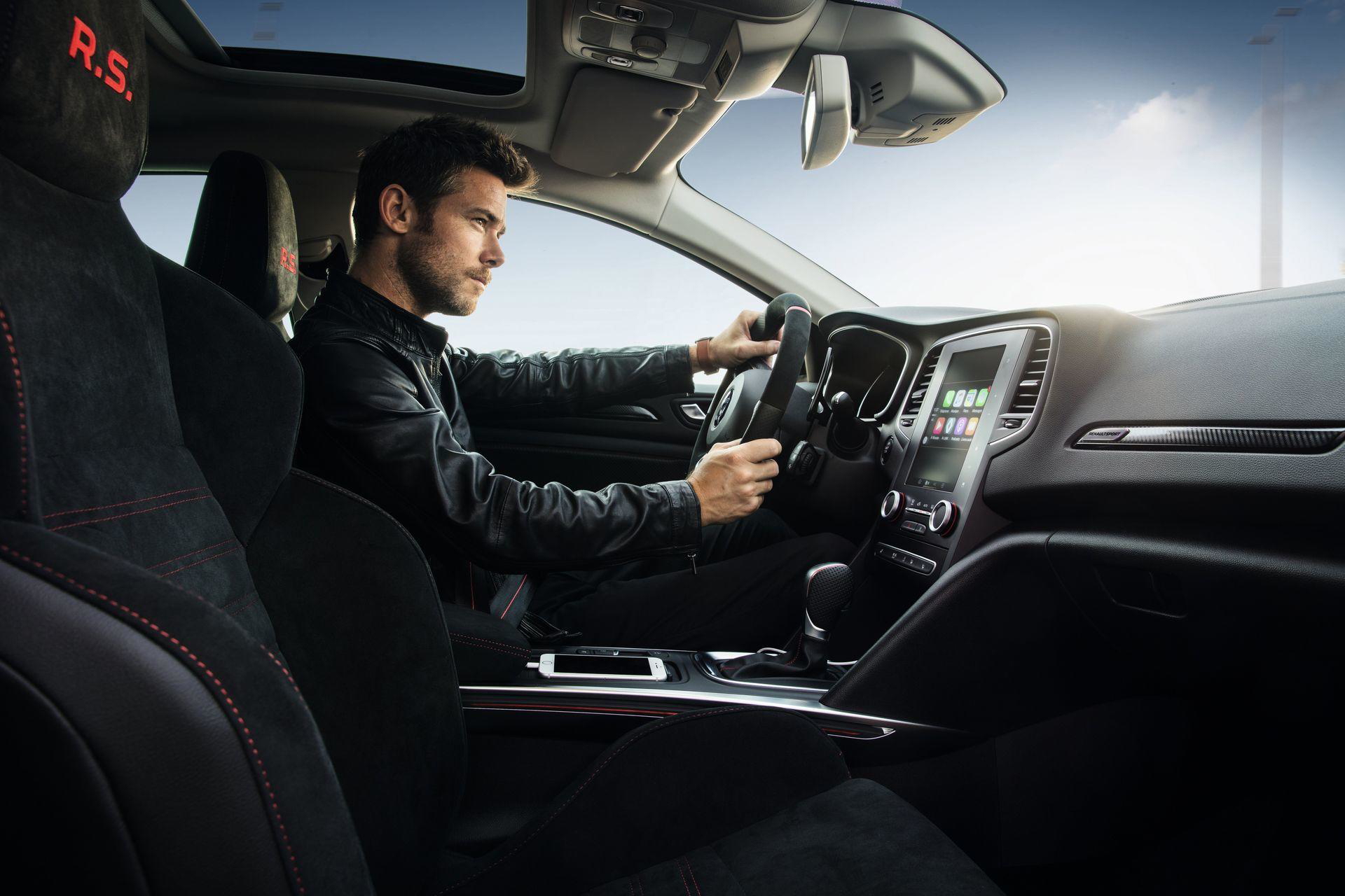 La instrumentación digital del compacto deportivo se tiñe de rojo y el conductor debe sujetar con firmeza un volante forrado en cuero perforado y Alcantara, con dos enormes levas de aluminio solidarias en el caso de la versión equipada con la caja de cambios EDC. El resto del habitáculo posee detalles en color rojo y molduras de aspecto deportivo en diversos paneles. En la tablet central, parte del sistema de infotainment R-Link 2, podremos cambiar entre los diferentes modos de conducción – cinco modos, Comfort, Normal, Sport, Race y Perso – y activar o desactivar las ayudas a la conducción.