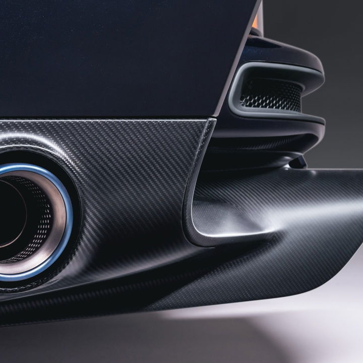 Los que busquen grandes pantallas en su interior se sentirán decepcionados, ya que se ha optado por una imagen de antaño, con uso de cuero, botones físicos y un tradicional aro redondo para el volante, para el cual han creado incluso una funda tipo acordeón como las que utilizaban en esas décadas de los sesenta y setenta. En resumidas cuentas, tecnología actual con una imagen clásica en la que hay guiños como el impresionante sistema de escapes en una aleación de Inconel y titanio que salen por los laterales tras el eje posterior, dejando en este caso toda la parte trasera para el impresionante difusor que se encargará junto al alerón de transmitir toda esa potencia al suelo a altas velocidades.