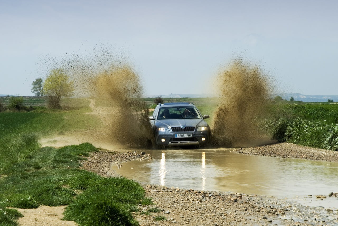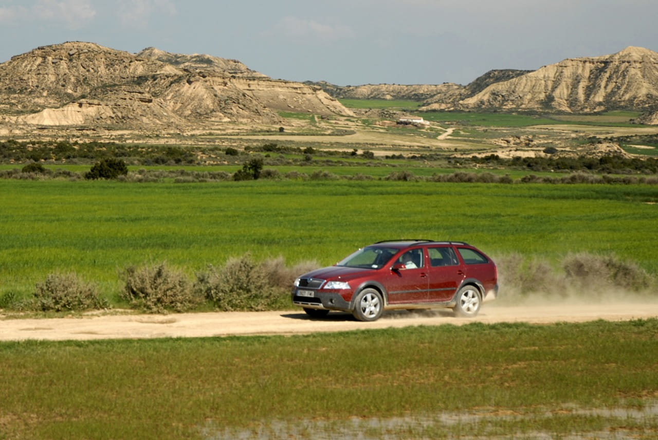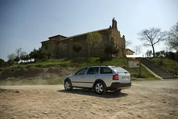 - Otra visión del todoterreno. No hay chasis de largueros y travesaños, ni reductora, pero sí un chasis alzado respecto a un familiar – se deriva del Skoda Octavia – y protecciones de plástico en bajos, pasos de rueda, y defensas, para evitar daños en pistas sin asfaltar