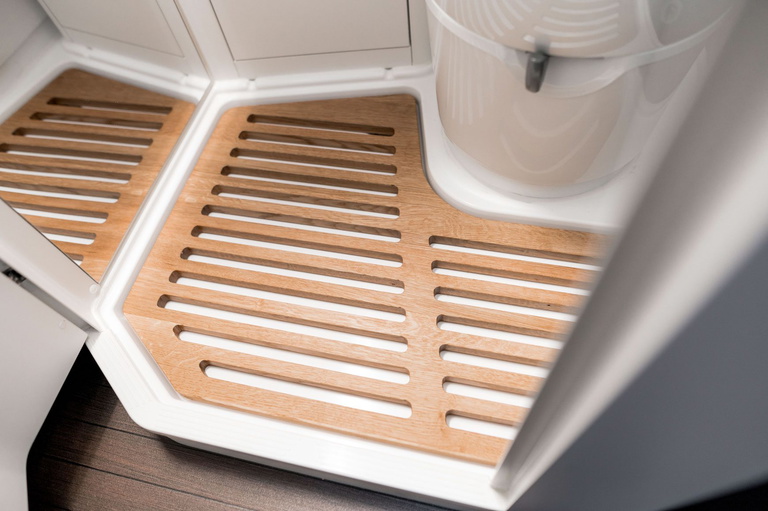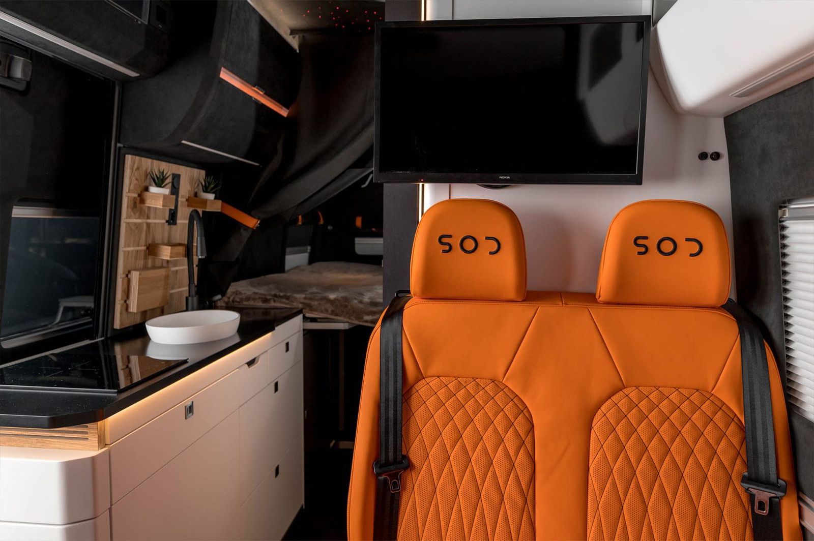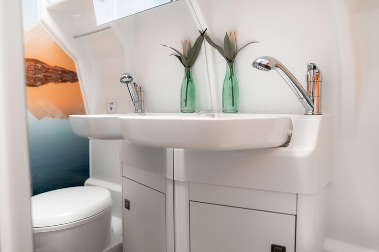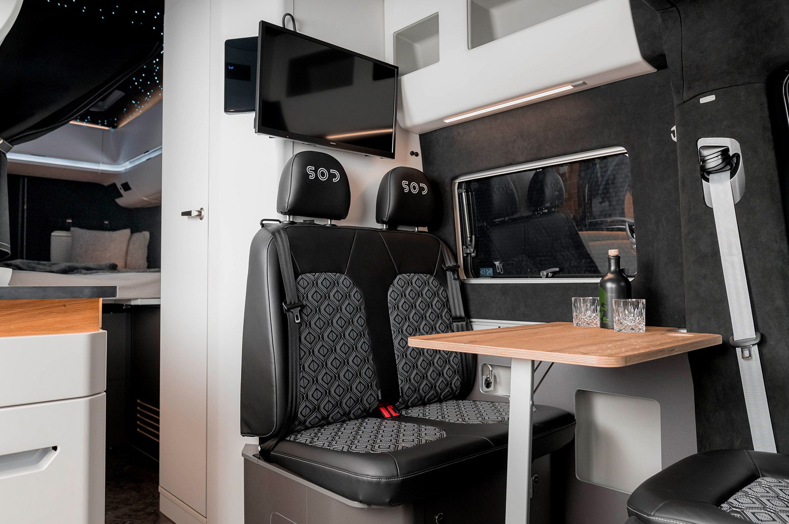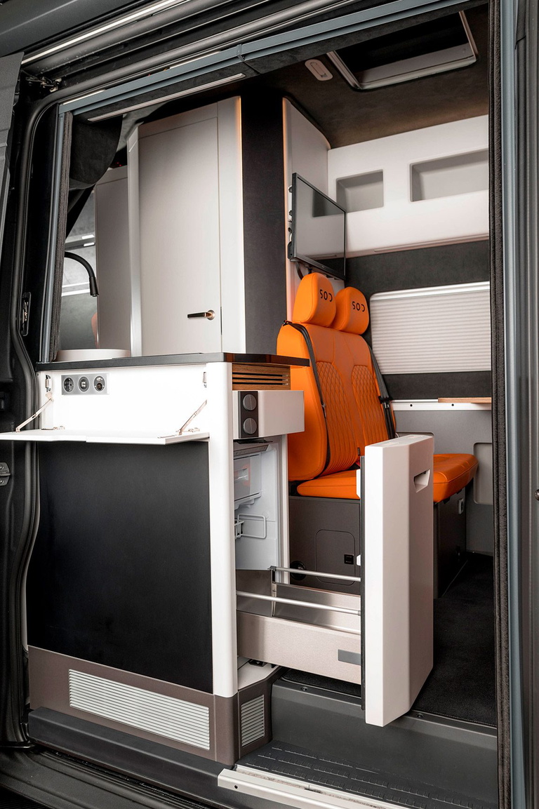 Para entretenerse hay un sistema de sonido desarrollado para este espacio concreto, más iluminación ambiental y televisión, todo domotizado y controlable desde el móvil. Trae mueble de cocina con encimera de piedra natural, fregadero, vitrocerámica y frigorífico oculto. Tenemos asientos delanteros reversibles, baño con ducha separados, y otros dos asientos de «comedor».