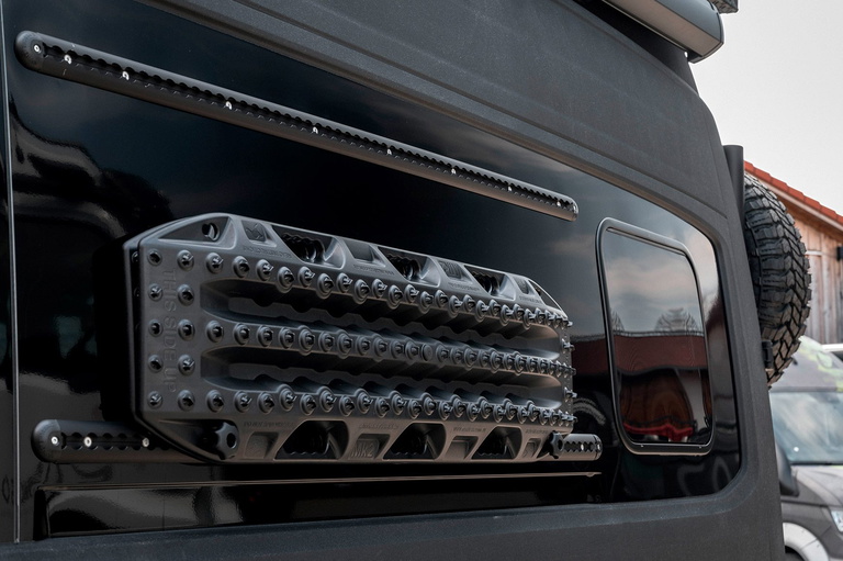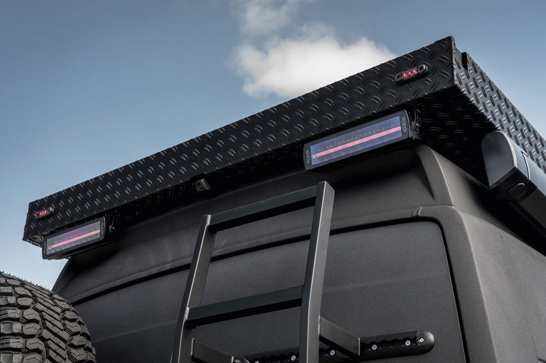 Mide 6m de largo, con 4,49m entre ejes y lleva un kit de carrocería con extensiones de guardabarros, defensa delantera, cabrestante, enganche de remolque, rampas de recuperación, toldo, escalón extensible, barras y focos LED en el portaequipajes del techo, snorkel, compresor de aire y un sistema de frenos mejorado para retener todos esos kilos adicionales.