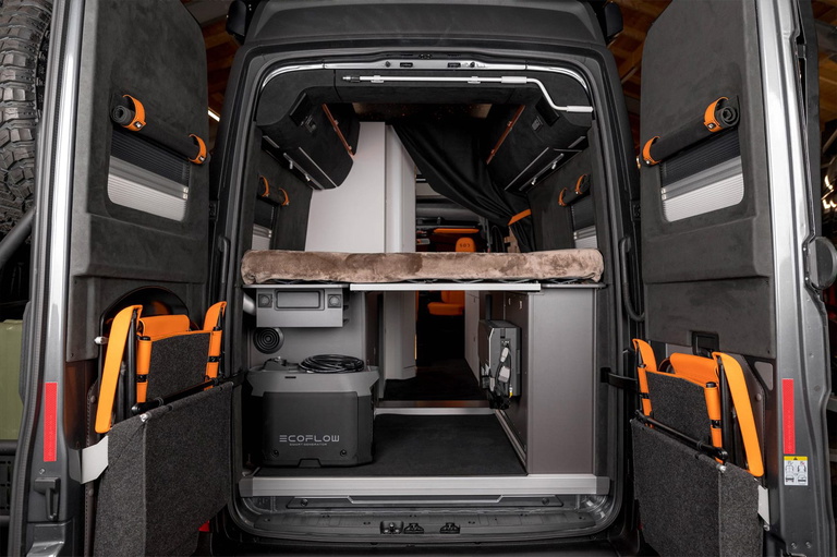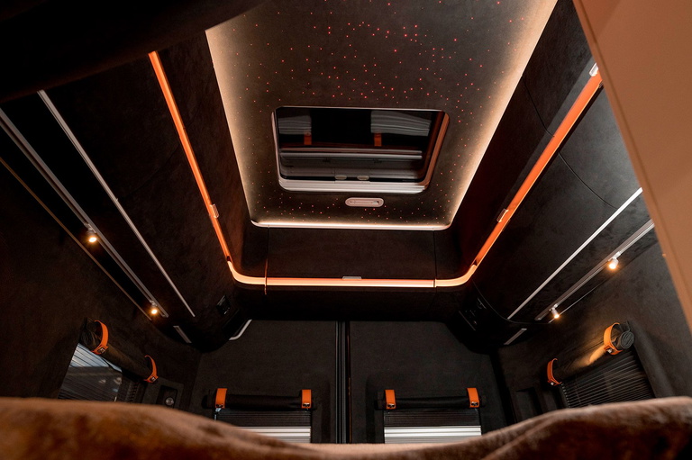 Dependiendo del grado de personalización, se puede encontrar cualquier cosa en el espacio habitable de este furgo, pero como elementos base tenemos un tapizado que conjuga alcántara con cuero por todas partes, «cielo estrellado» con 300 puntos de luz en la zona de descanso, madera en paredes, suelo de ducha y mesas, suelo de gres porcelánico efecto mármol, persianas aislantes y hasta unas sillas plegables de exterior que se encajan en los portones traseros.
