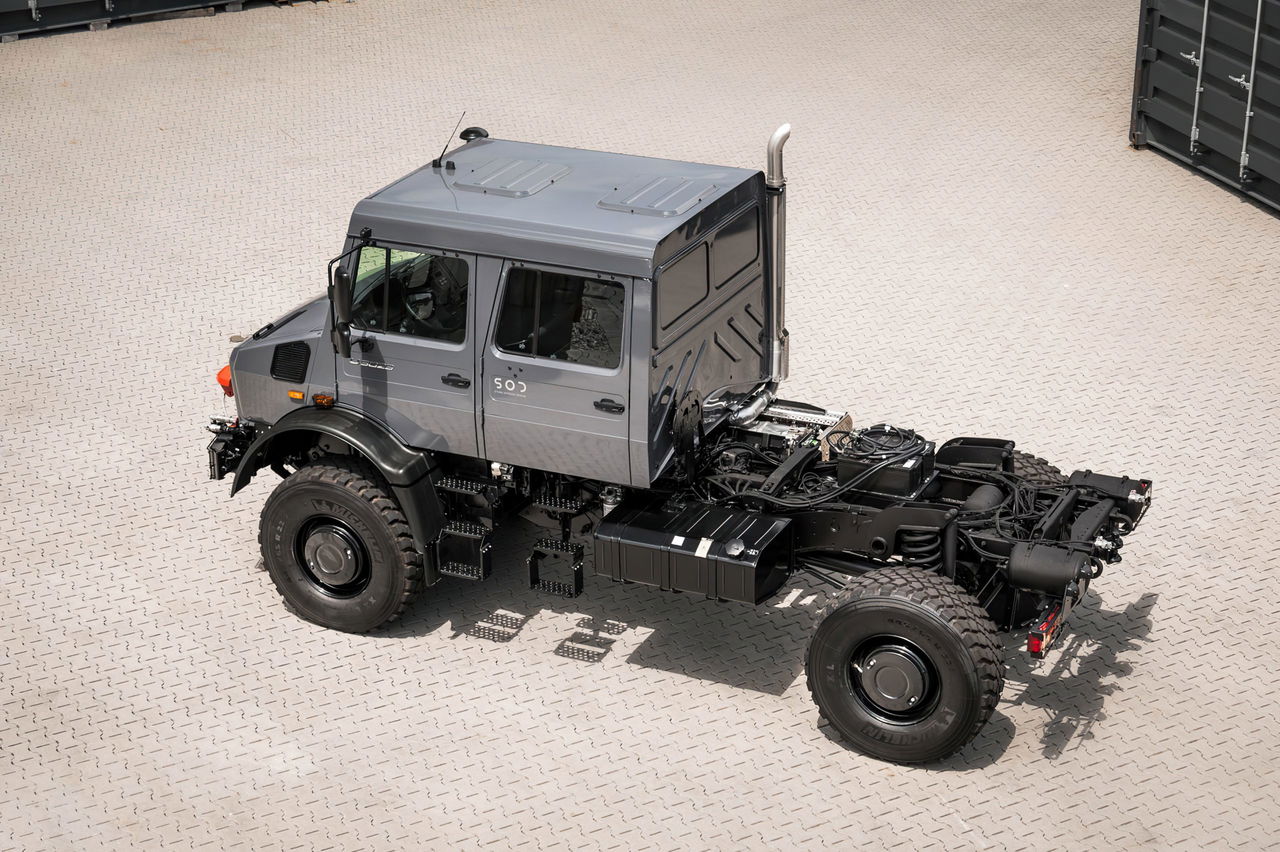 En la cabina independiente, los asientos tienen suspensión neumática independiente y están constituidos en cuero al más estilo Mercedes Clase G. No olvidemos que el Unimog es un bicho de trabajo y que sus interiores suelen ser algo más espartanos, pero SOD también quiere trabajar en esto.