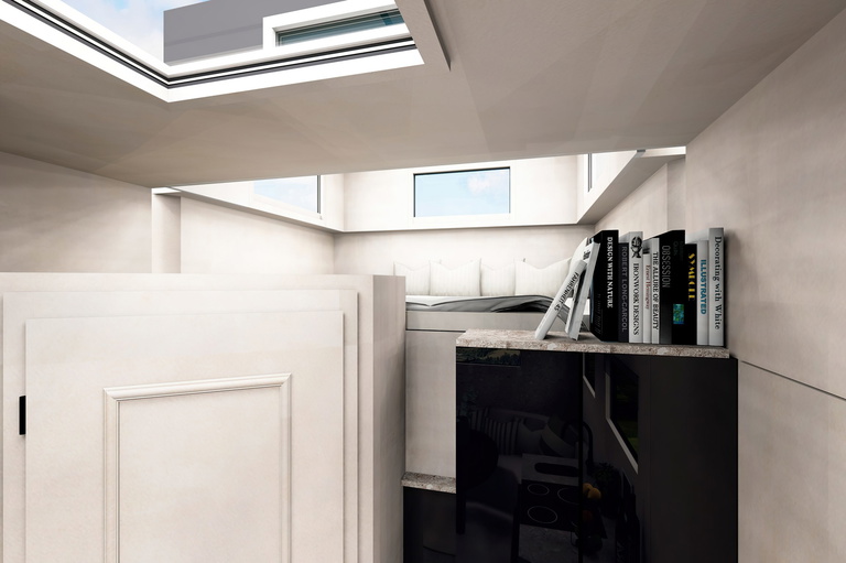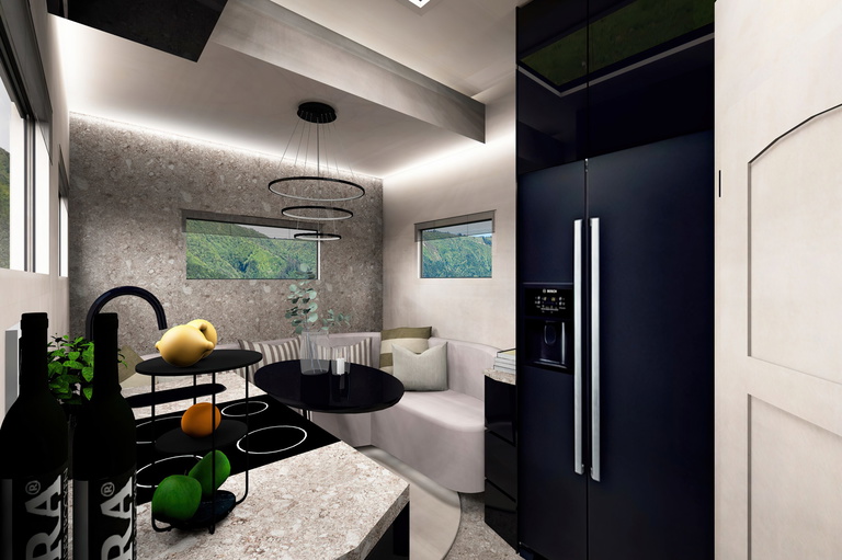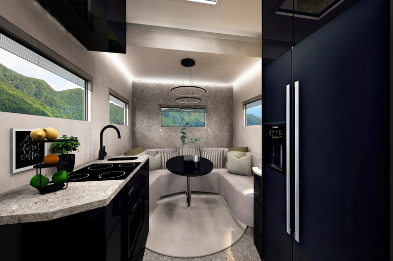 El módulo vivienda cuenta con nevera americana tamaño persona con 160 litros de capacidad total entre congelador y frigorífico, cama king size (2x2m) que se mueve eléctricamente para mejorar el espacio de la cabeza, calefacción por suelo radiante, equipo diésel de 6kW con caldera de 6 litros, sistema de sonido premium, router con conexión global, tanque de agua dulce de 600 litros, tanque de aguas grises de 200 litros y tanque de aguas negras de 200 litros.