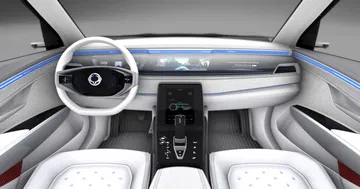 Si por fuera ya nos parece espectacular, un vistazo al interior nos lleva a comprobar que SsangYong no quiere quedarse atrás en sistemas de entretenimiento e interacción con el conductor y sus pasajeros. El SsangYong e-SIV cuenta con un salpicadero en el que se proyecta información, a modo de pantalla, aprovechando cada centímetro para incorporar pantallas que funcionan en la práctica como la instrumentación, y como el sistema de entretenimiento. En la consola central también se aprecia cómo se han incorporado interfaces táctiles, en sustitución de los botones tradicionales.