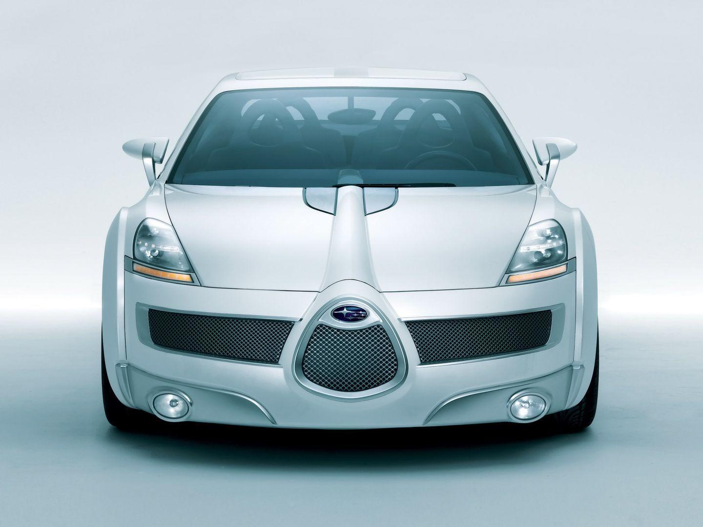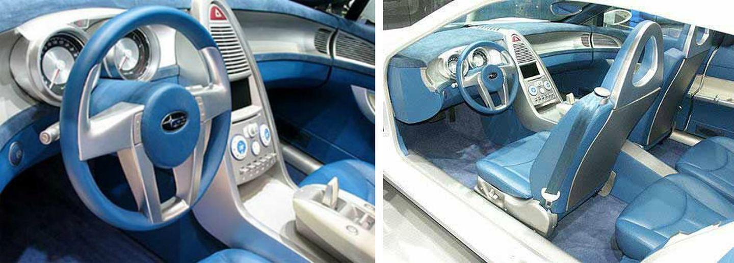 El interior era puro concept car, con abundante aluminio y un omnipresente tapizado de Alcantara de color azul. Apenas hay imágenes de calidad del interior, pero en esta composición puede apreciarse la ausencia de pilar B – ¿de qué otro deportivo coetáneo me suena? – y el aspecto envolvente del salpicadero. Salvando las diferencias, el diseño de la consola central acabaría estando presente en los Subaru de producción de la pasada década. Como antes os decía, este concept anticipaba el futuro estilístico de la marca.