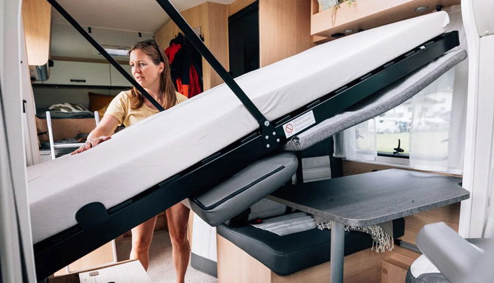 Al igual que sucede con las campers gran volumen, la Sunlight V67S se disfrutará mucho más en pareja dado que el ancho interior no es tan generoso como en las autocaravanas convencionales y se nota en la cocina, baño o zona de dormir. A pesar de esto, la marca ofrece una cama opcional y abatible en el salón que sale de un lateral, una solución única que permite eliminar la cama del techo, añadiendo mayor altura en el interior.