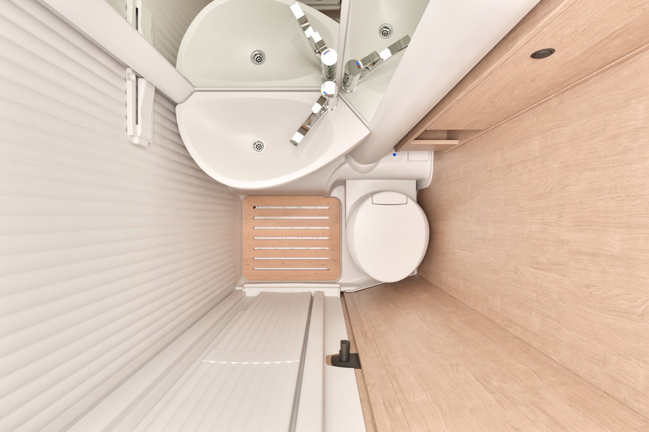 La V67S cuenta además con una zona posterior con camas gemelas de buen tamaño y debajo, un práctico garaje en el que podrás hasta un scooter pequeño. El baño que llevan estas Vans no gustará a todos al ser de tipo variable pero permite tener en un espacio muy reducido tanto la ducha como el aseo aunque por separado. Es una pared movible la que hará que tengas acceso a uno u otro.
