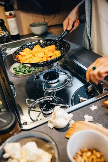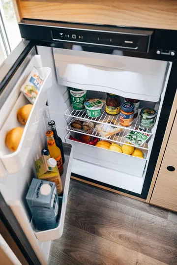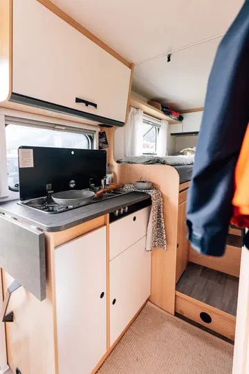 La cocina es pequeña pero agradable y cuenta con todo lo necesario para que puedas cocinar sin problemas. Sorprende que el frigorífico de serie tenga una capacidad de 137 litros con un pequeño congelador de 15 litros, siendo más grande de lo normal en campers y autocaravanas de ancho compacto. También se incluye una cocina a gas con dos fuegos con fregadero integrado en la misma plancha.