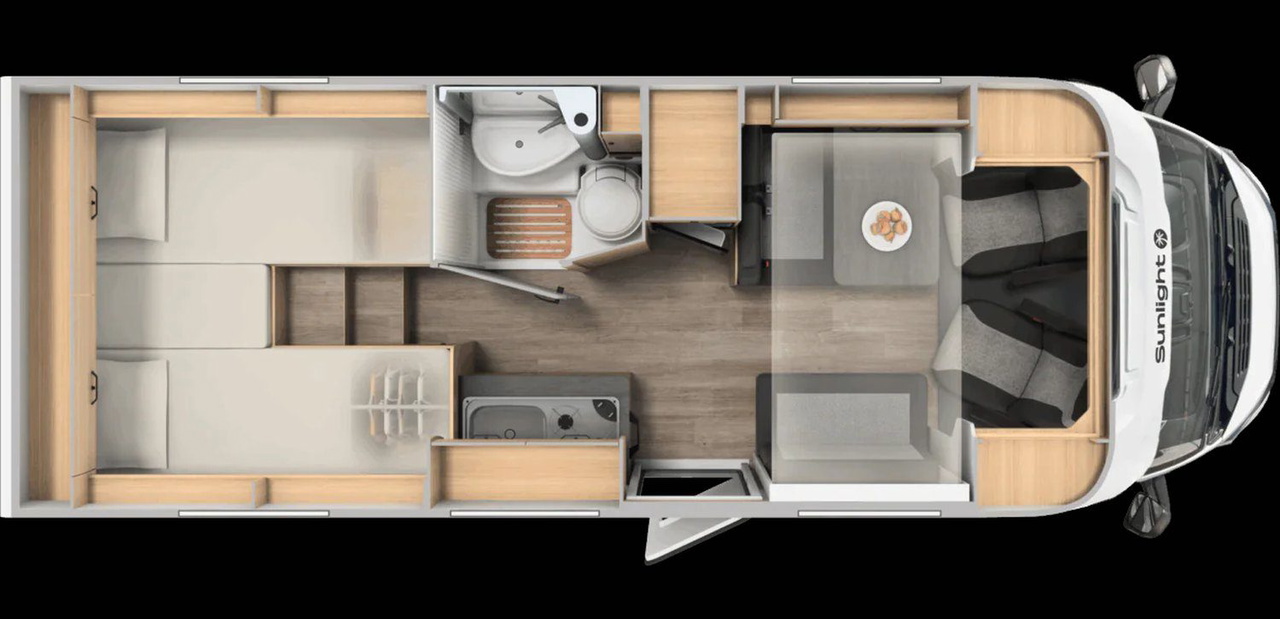 La Sunlight V67S forma de parte de lo que la empresa alemana denomina «Vans» y no son otra cosa que autocaravanas convencionales pero con el ancho reducido para que resulten casi tan manejables como las furgonetas camper de gran volumen pero siendo más prácticas, con un interior distribuido igual que en las autocaravanas. De la oferta de Vans de Sunlight, la V67S se destaca por incluir una cama abatible opcional única en el mercado.