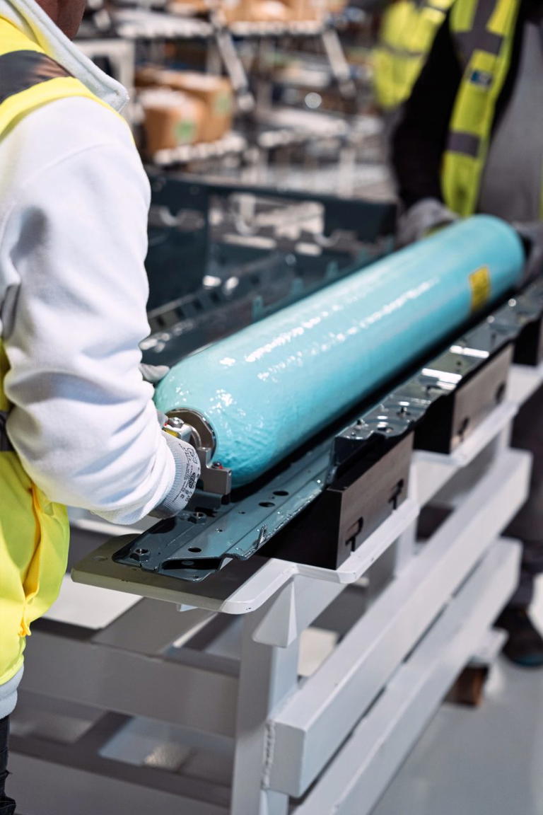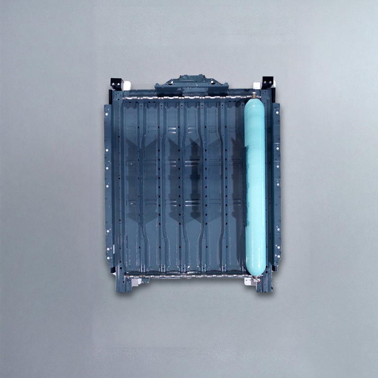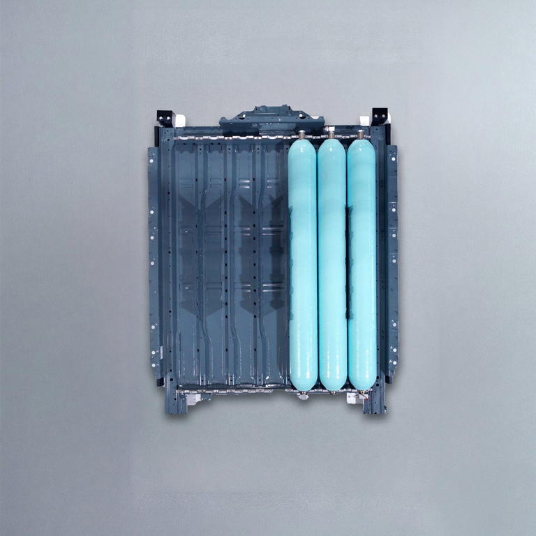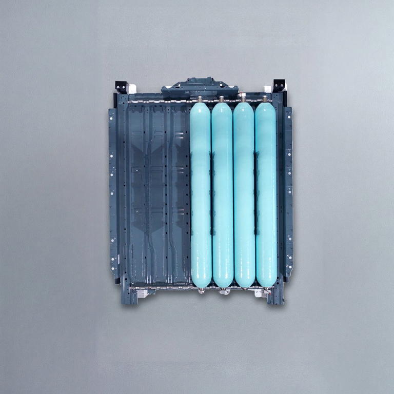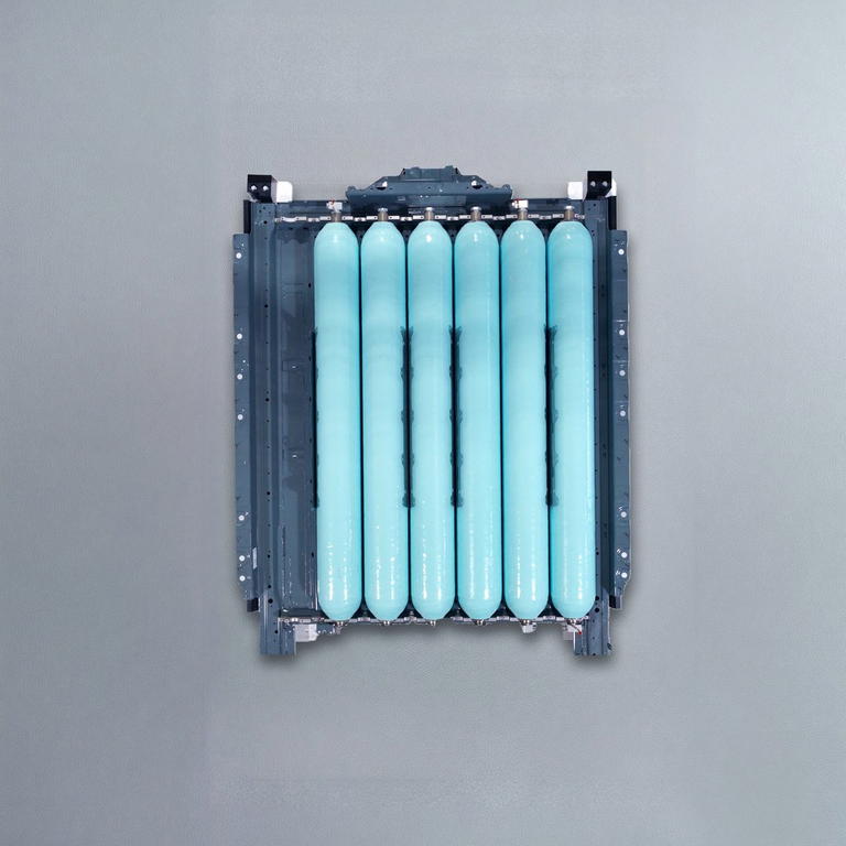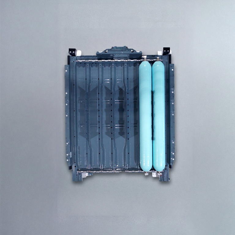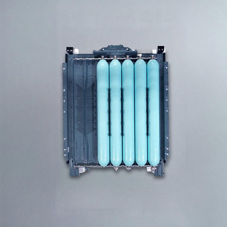El nuevo sistema de depósitos «planos» consta de siete bombonas fabricadas en plástico reforzado con fibra de carbono (CFRP), conectadas en paralelo e integradas en un robusto bastidor metálico que forma parte de la estructura del vehículo -similar al armazón de una batería-. Los depósitos son muy seguros y resistentes, y con el nuevo bastidor se termina de despejar las dudas.