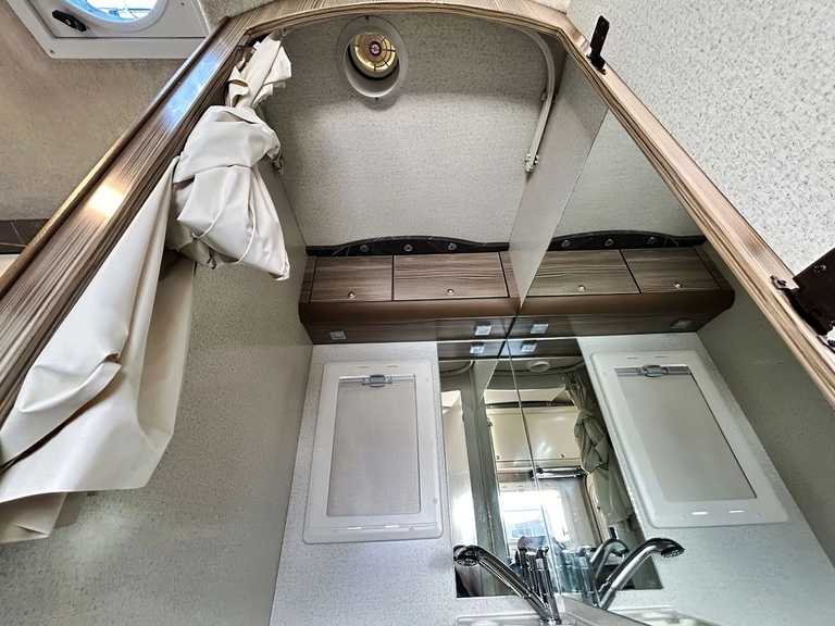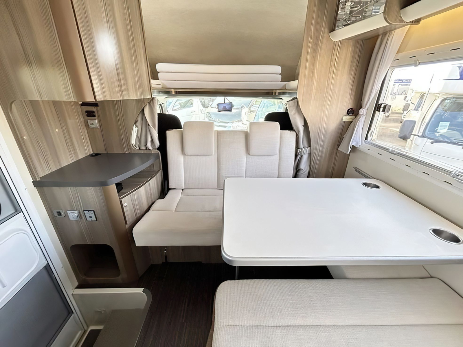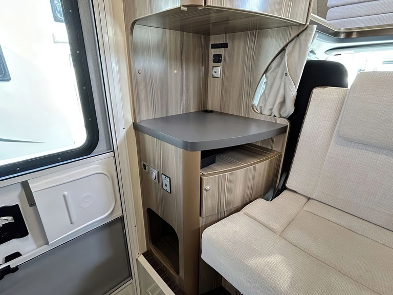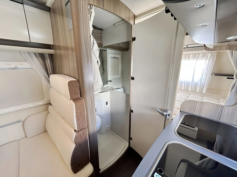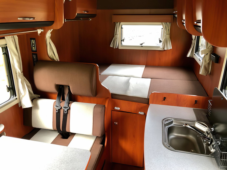 El interior está bien distribuido. Está la típica zona de cocinar con fregadero, fogones y frigorífico. hay multitud de armarios para almacenamiento, baño independiente, zona comedor y la parte de las camas.