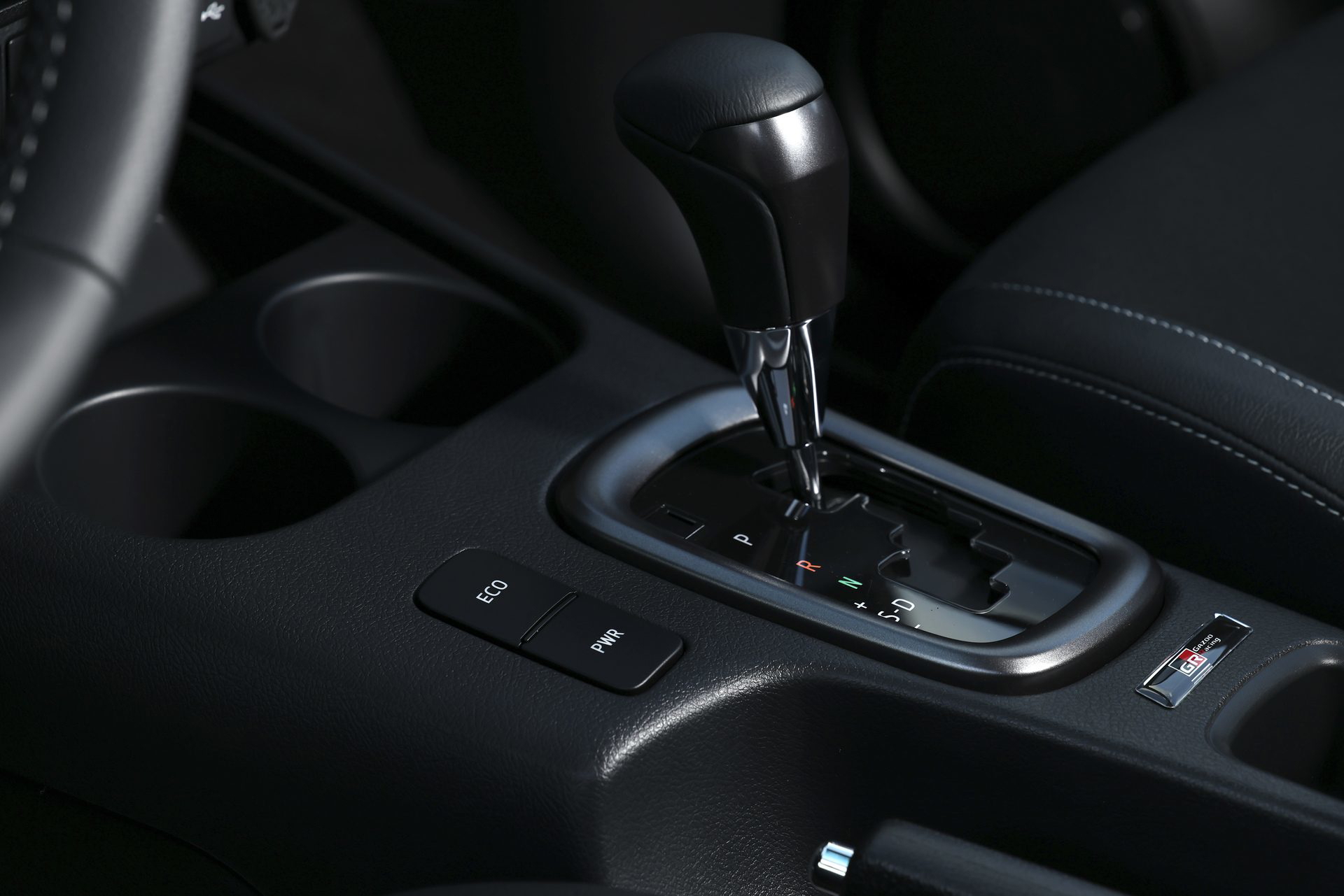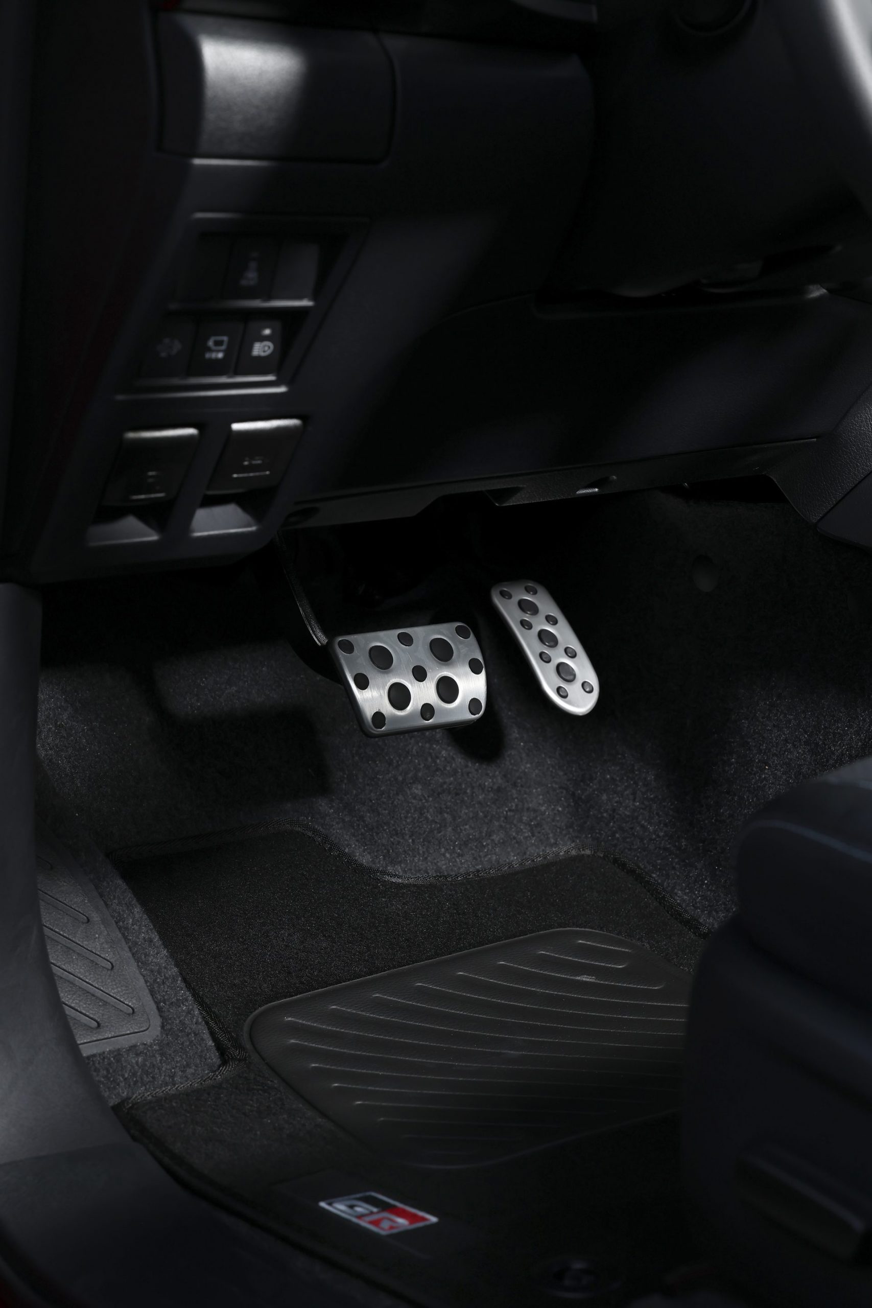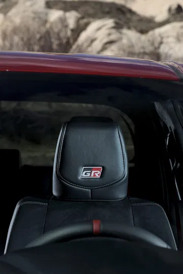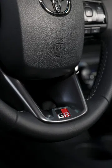 La carrocería contrasta con los detalles en negro: estribos laterales, retrovisores, manijas de las puertas, barra aerodinámica deportiva y parachoques trasero. Todo ello se combina con el protector inferior delantero plateado y el distintivo emblema GR Sport.