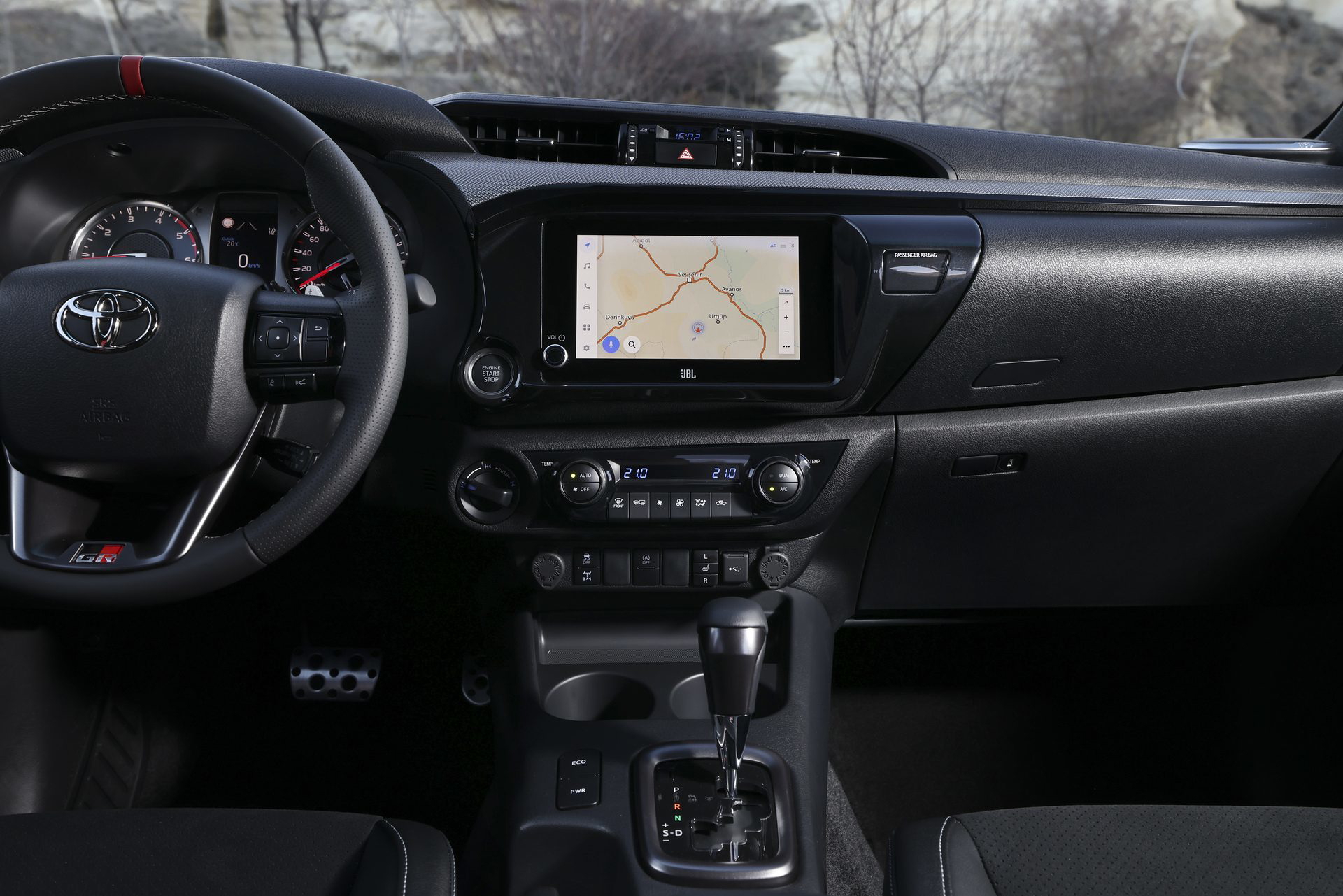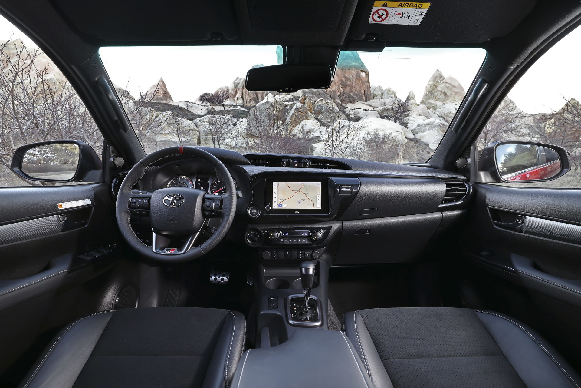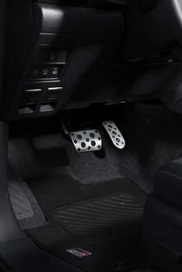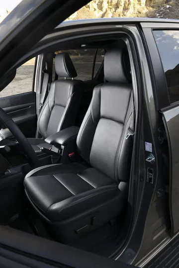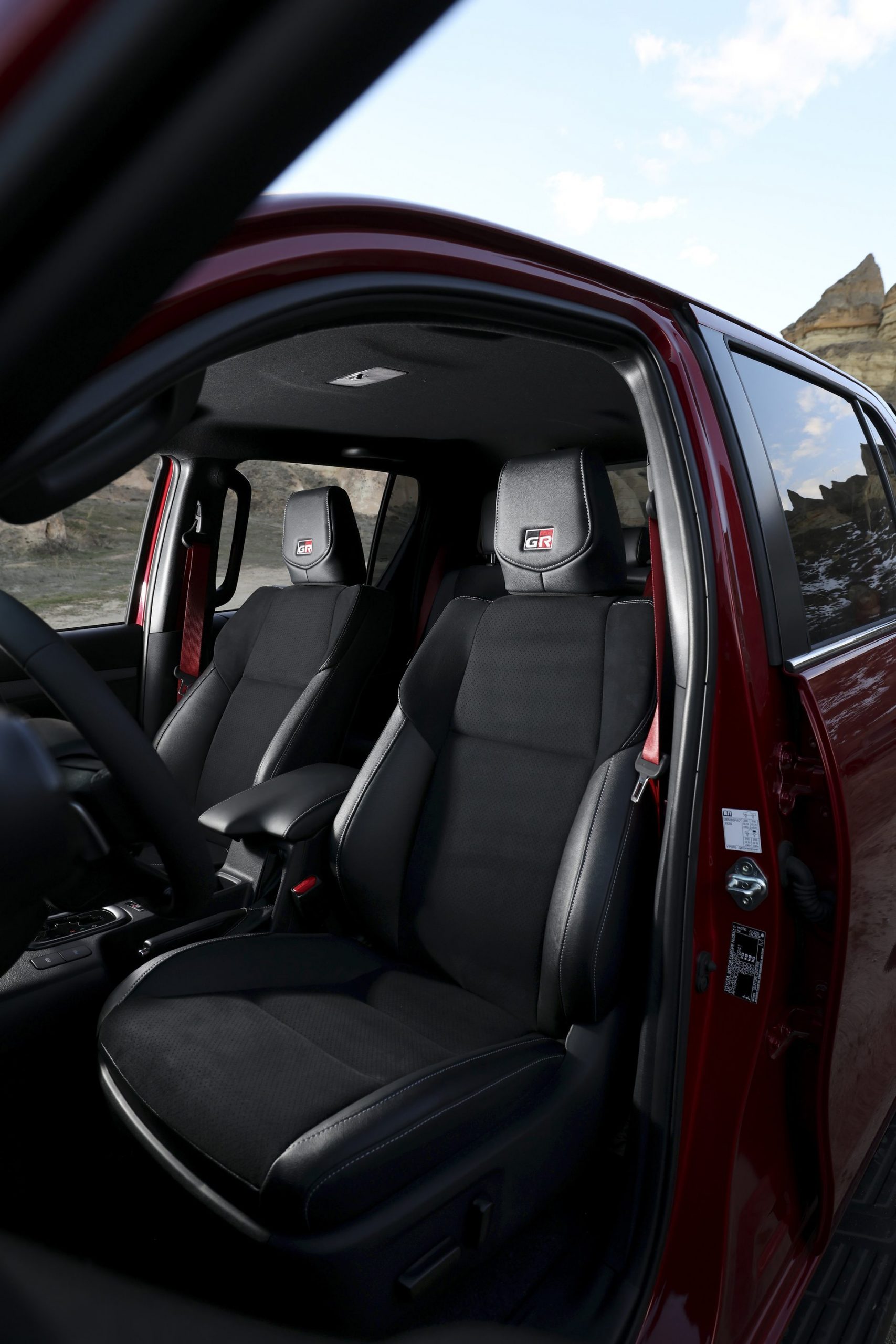 En el habitáculo, los asientos deportivos van tapizados en cuero y ante sintético. La tapicería negra se combina con costuras plateadas y detalles en rojo, como los cinturones de seguridad. Los toques deportivos también son evidentes en los pedales de aluminio o las levas metálicas tras del volante. Esta Hilux lleva incluso adornos de fibra de carbono en las puertas y el salpicadero.