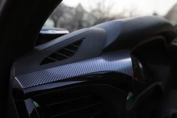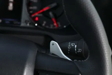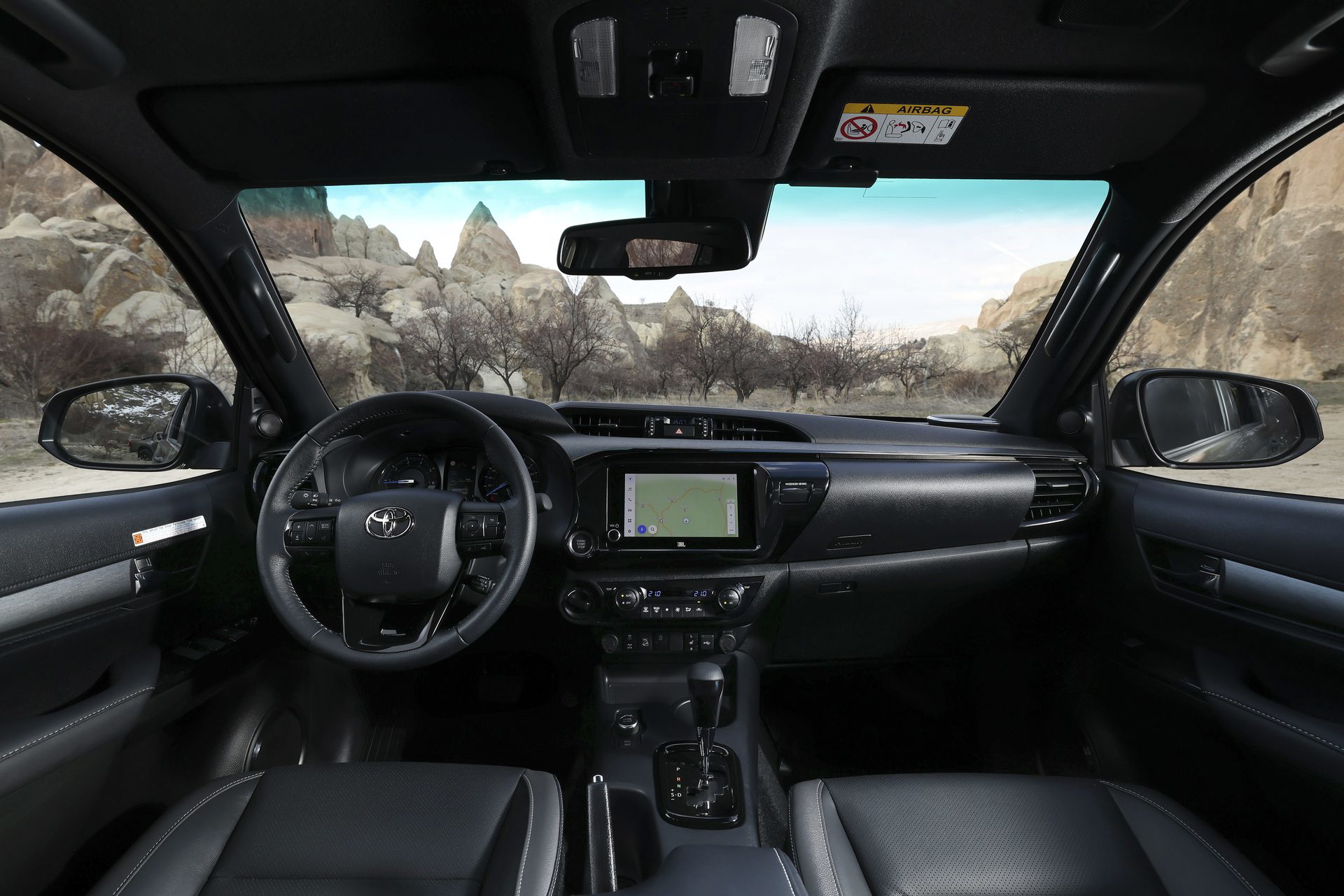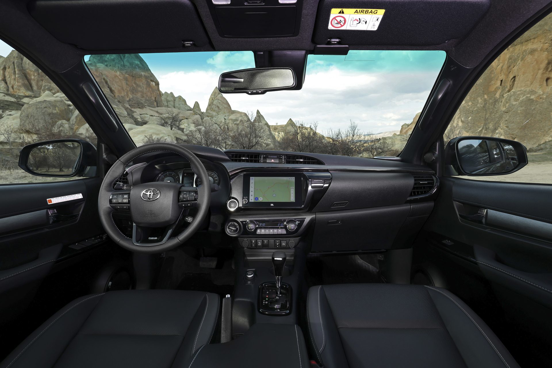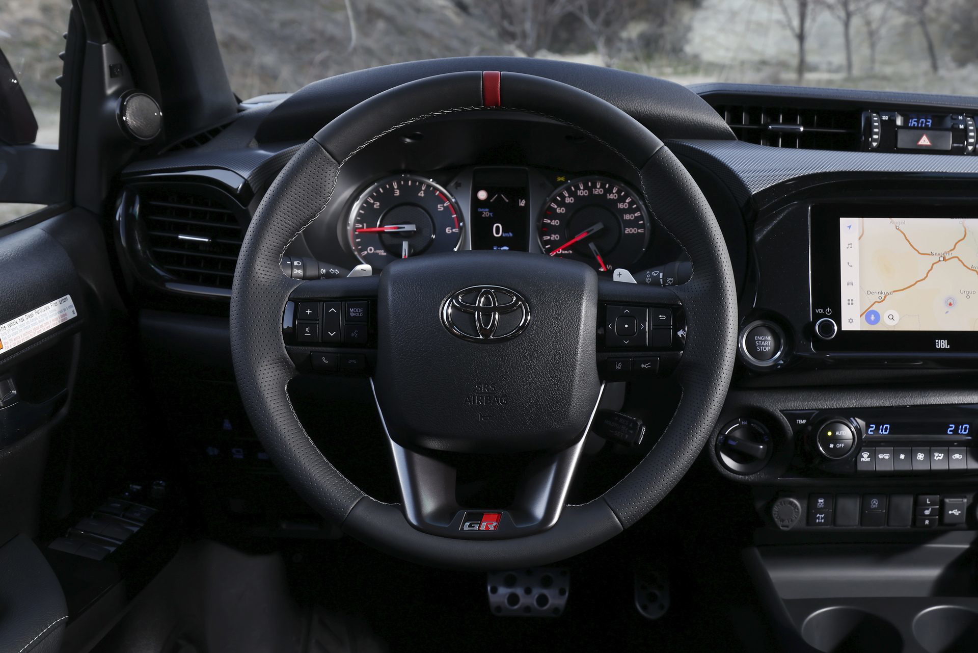 En el habitáculo, los asientos deportivos van tapizados en cuero y ante sintético. La tapicería negra se combina con costuras plateadas y detalles en rojo, como los cinturones de seguridad. Los toques deportivos también son evidentes en los pedales de aluminio o las levas metálicas tras del volante. Esta Hilux lleva incluso adornos de fibra de carbono en las puertas y el salpicadero.