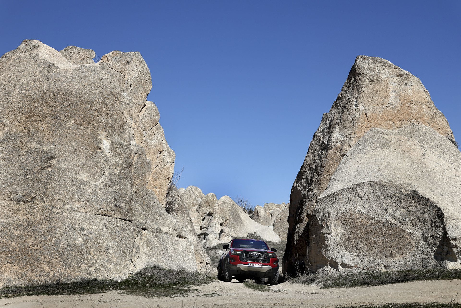 La Hilux normal ya tiene una presencia imponente y la GR Sport II sube el listón todavía más. Las vías más anchas vienen acompañadas de unos pasos de rueda más anchos y un paragolpes también anchísimo que incluye una «cortina de aire» para mejorar la aerodinámica. Por si había alguna duda, el nombre TOYOTA va escrito en la parrilla con la tipografía clásica.