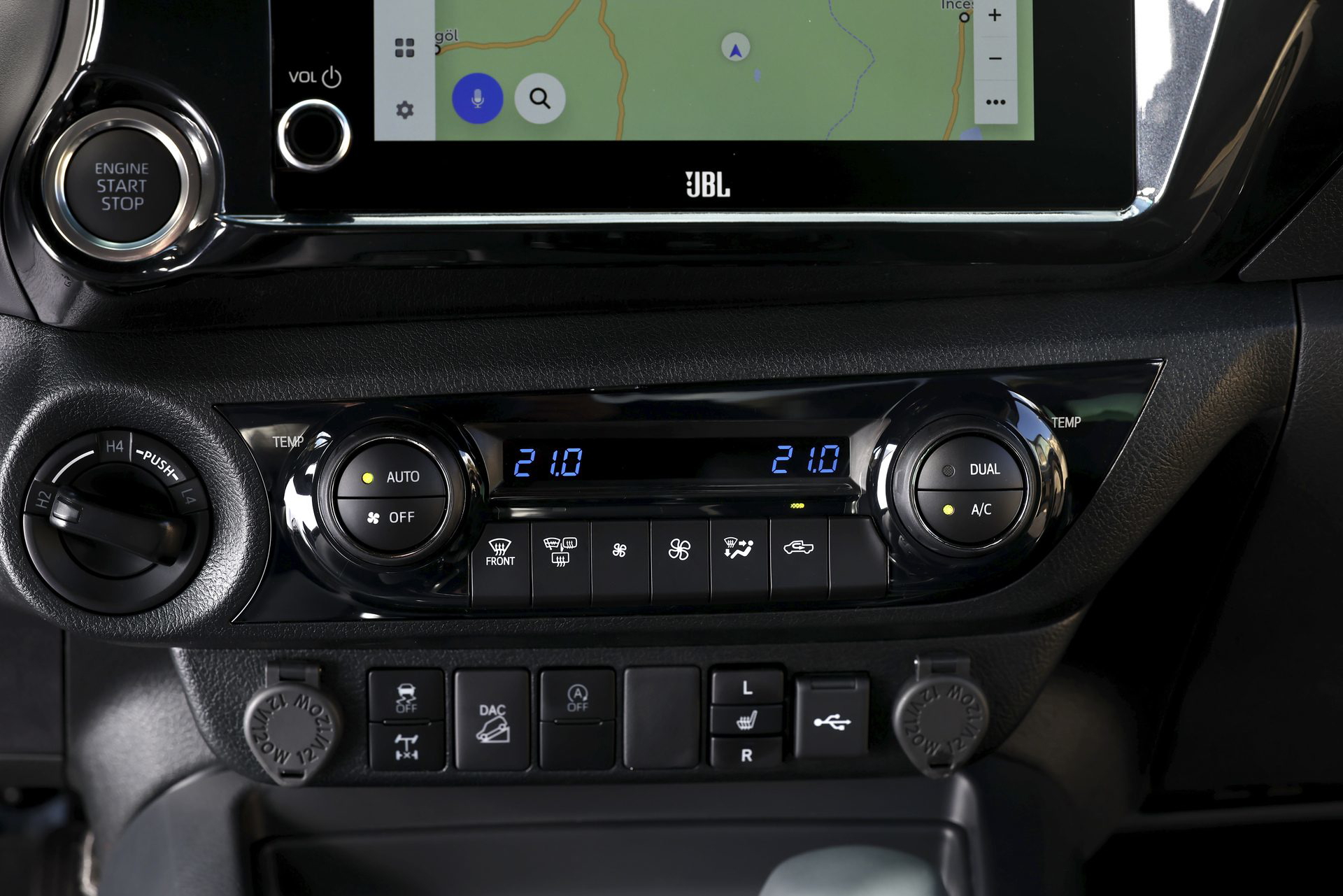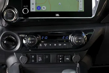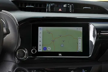 El robusto motor de gasóleo se combina con un generador eléctrico de 16,3 CV y 65 Nm y una pequeña batería de lito de 48 voltios. No puede mover la pick-up en modo eléctrico, en este caso el sistema microhíbrido mejora la respuesta a bajas vueltas, reduce el ralentí de 720 a 600 rpm y hace más suave el funcionamiento del sistema Start/Stop. Además, Toyota asegura que reduce el consumos y las emisiones en un 5%.