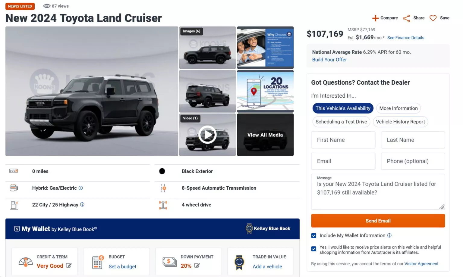 Un concesionario de Virginia, Estados Unidos, se ha convertido en noticia por haber ofertado una de las nuevas unidades del Toyota Land Cruiser por nada menos que 107.169 dólares, casi 100.000 euros (99.558 euros) según cambio de divisas de mayo de 2024. No sólo resulta un precio escandaloso de por sí, sino que también lo es teniendo en cuenta que el precio oficial del Land Cruiser en Estados Unidos es de unos 77.169 dólares, unos 71.688 euros.