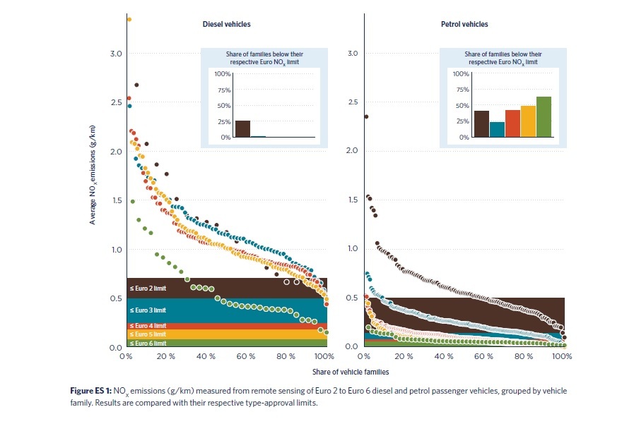 Los autores del estudio destacan lo elevado de las emisiones de NOx en condiciones reales y que, en en estas circunstancias, «apenas ha habido reducción» desde los Euro 2 a los Euro 5. En el caso de los diésel, el Euro 6 que menos contamina ya emite prácticamente el doble de lo permitido, e incluso hay cuatro fabricantes cuya media multiplica en más de 12 veces el límite legal establecido.