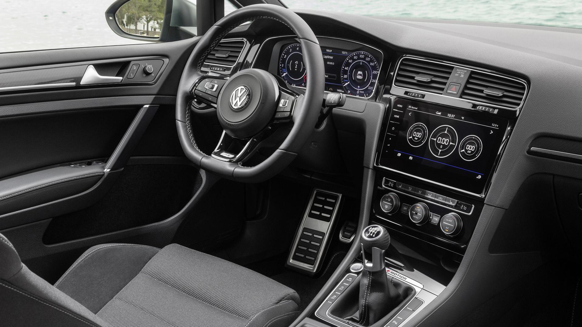 Como equipamiento de serie el Golf R cuenta con control de crucero adaptativo, sistema multimedia con pantalla táctil de 8 pulgadas, navegador, retrovisores abatibles eléctricamente, sensores de aparcamiento, sensores de luz y lluvia, climatizador bizona, luces LED, instrumentación digital Volkswagen Digital Cockpit y los cambios estéticos propios de esta versión, con las llantas de aleación de 18 pulgadas, los nuevos paragolpes, los asientos deportivos…
