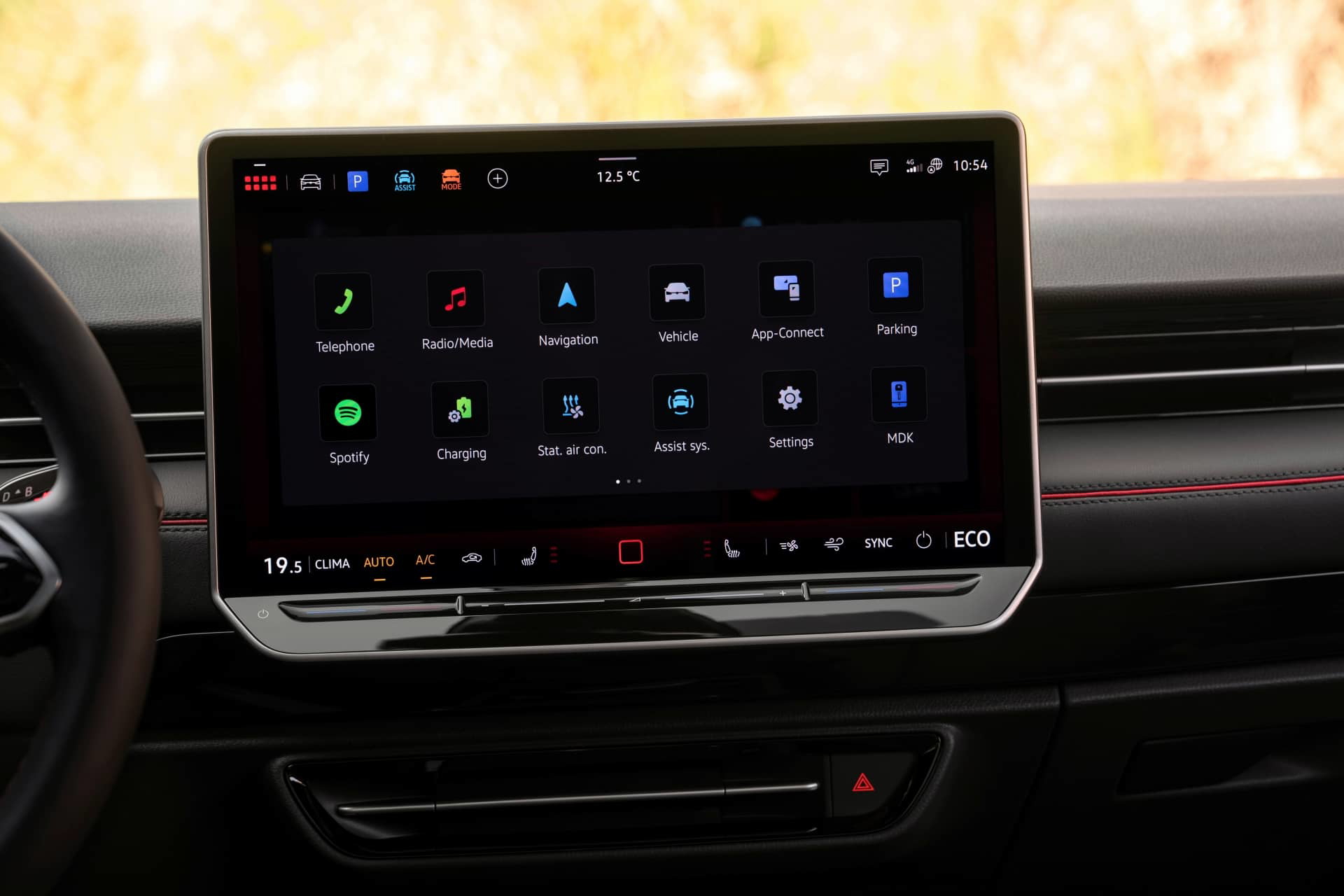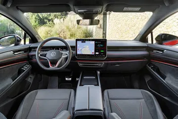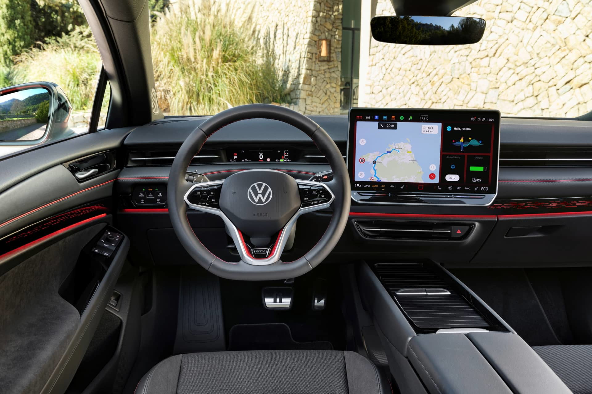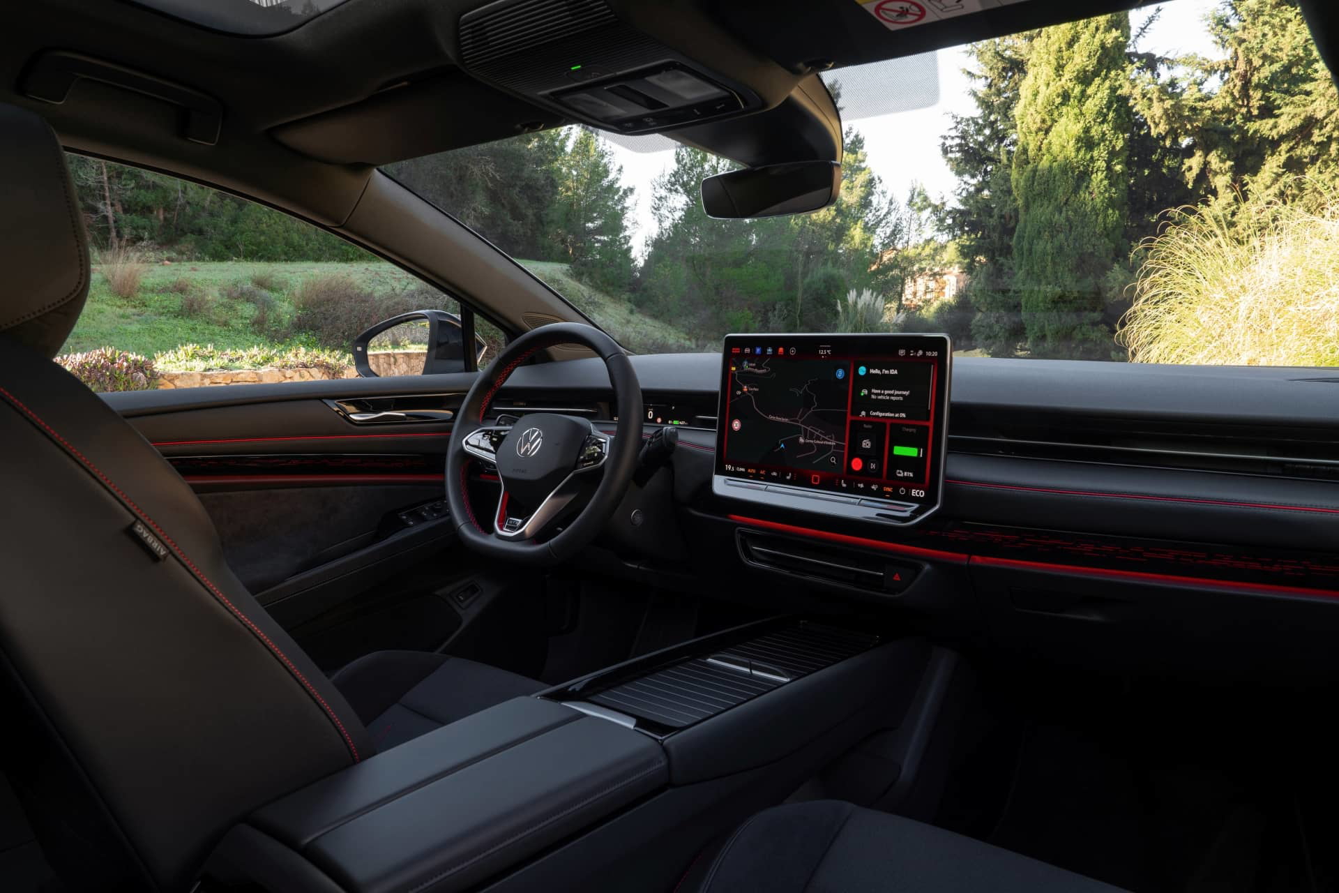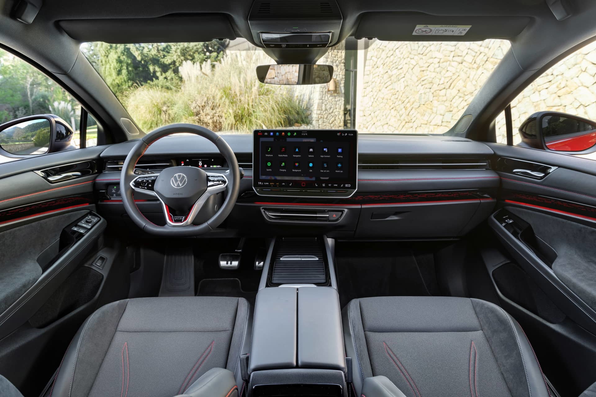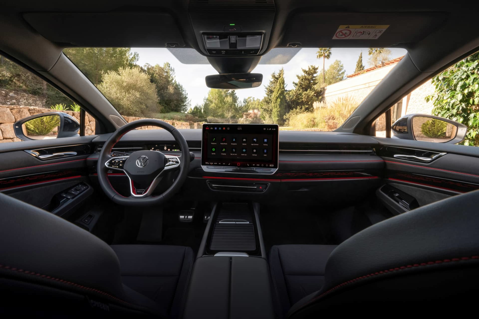 En el interior se combina la microfibra, la piel y el uso de costuras en color rojo, ofreciendo una atmósfera distinta a lo ya visto en la gama ID.7, aunque siempre desde un punto de vista elegante y sobrio, sin nada que resalte o llame en exceso la atención.