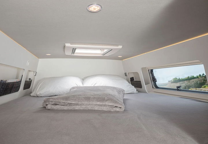 Las dimensiones del garaje son realmente generosas, con una longitud máxima de 2,20 metros, una anchura de 1,37 metros entre los pasos de rueda y una altura de nada menos que 1,43 metros. Justo en la zona superior se sitúa la cama de matrimonio de enormes dimensiones, con 1,70 metros de ancho y un largo que roza los dos metros. Por supuesto hay varias tomas de corriente, lámparas e incluso ventanas para poder ventilar (una claraboya también se añade en el equipamiento de serie).