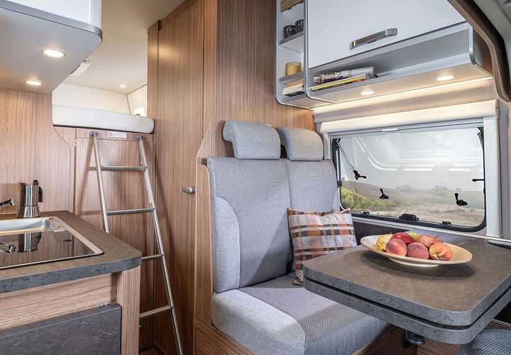 En la zona del salón encontramos el espacio habitual en una camper convencional con suficientes centímetros para que cuatro pasajeros puedan viajar y comer de manera confortable. La cocina tiene unas dimensiones discretas pero al ser una camper más alta de lo habitual tiene armarios de mayor capacidad, muy útiles y espaciosos.