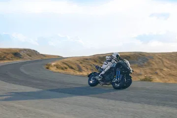 Ahora bien, esta merma en la dinámica sólo sería perceptible a un ritmo muy alto, alejado del público de una moto deportiva de tres ruedas. En el vídeo se puede comprobar cómo la moto tumba de forma ostensible, haciéndonos incluso dudar de la frase que acabamos de escribir. Como es evidente a la vista de las imágenes, el vehículo también gana en anchura y en peso. En cuanto al resto de la parte ciclo, no hay cambios a destacar: la moto posee una caja de cambios convencional con sistema QSS de cambio rápido, una transmisión final por cadena y ese característico escape, discreto y muy cercano a la rueda trasera.